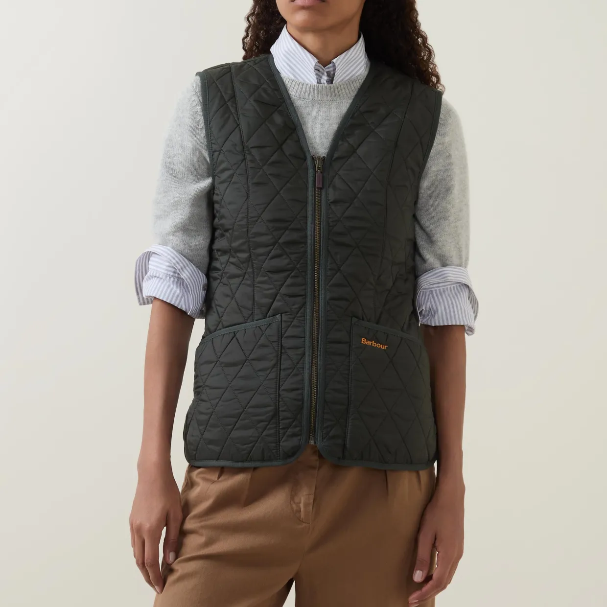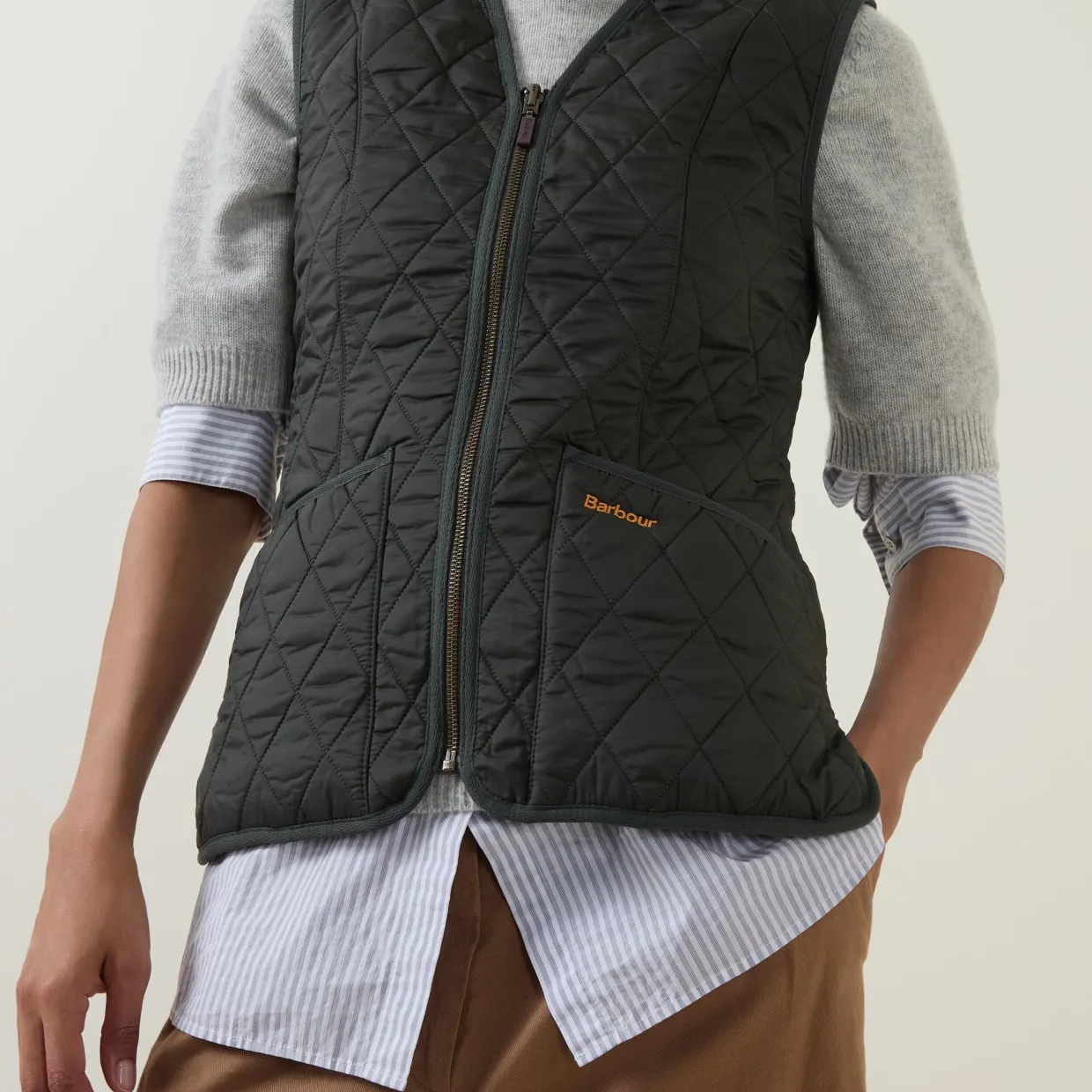 - V-neckline, sleeveless design, front zip fastening, two front slip pockets, straight hem, bound trims, embroidered logo detailing, quilted finish, fleece-lined