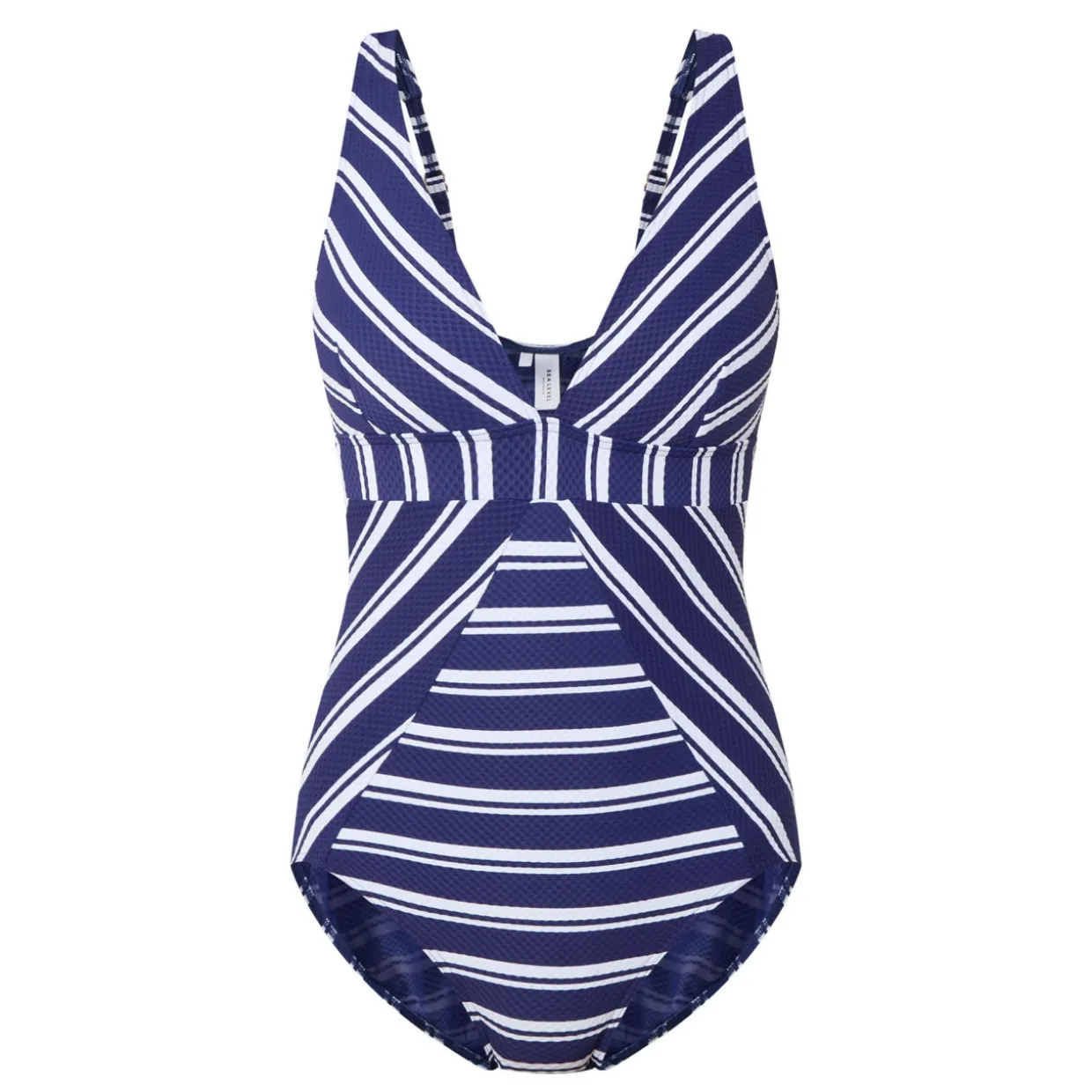 - One-piece design, adjustable detachable straps, plunging V-neckline, contrasting panelled design, striped pattern, logo detail, high-cut leg, moderate rear coverage, smooth seamless finish