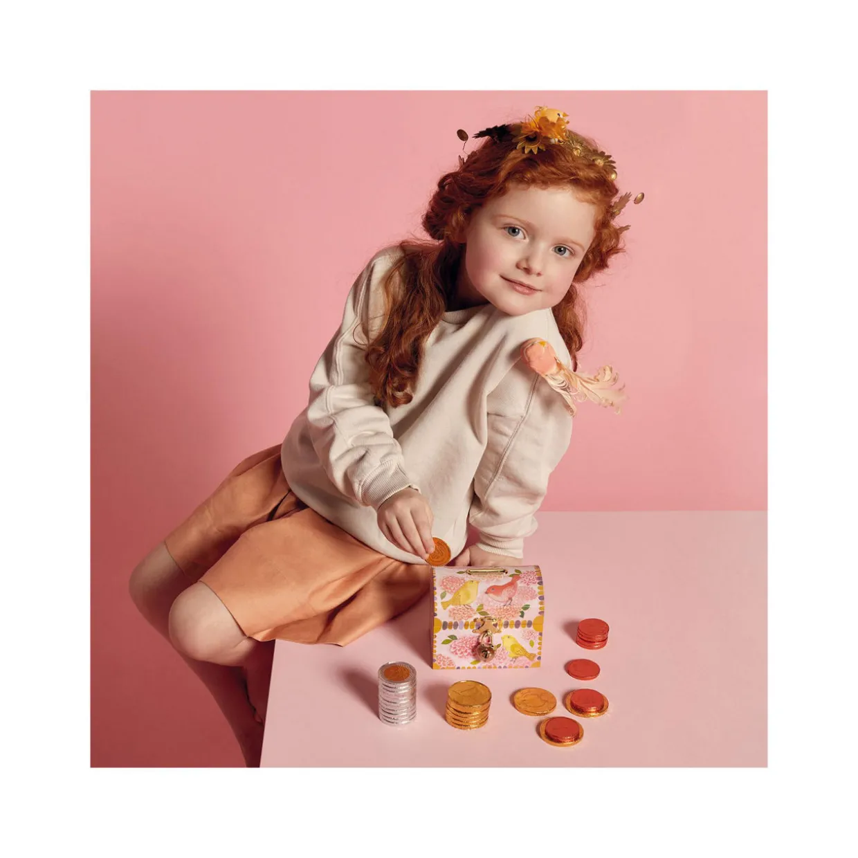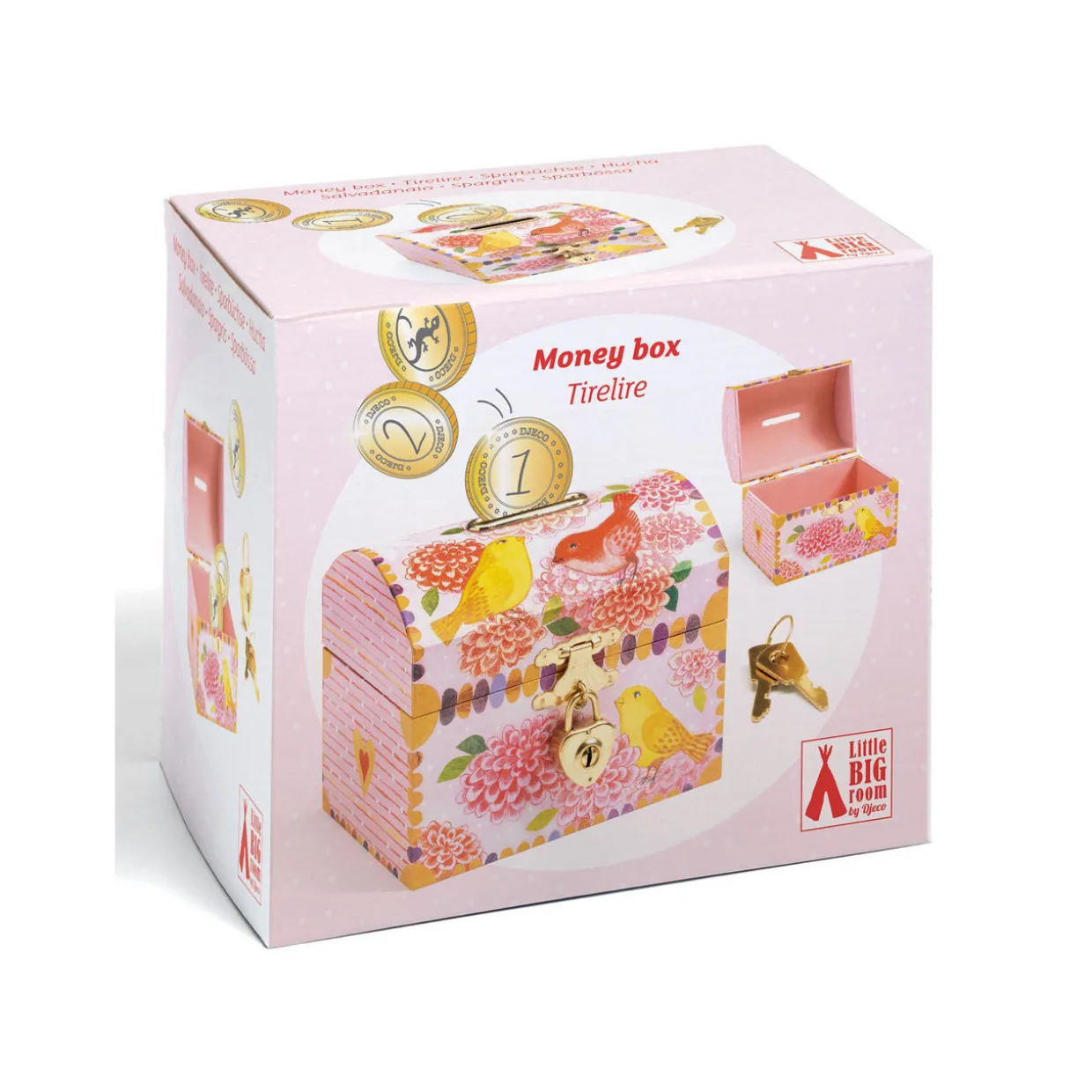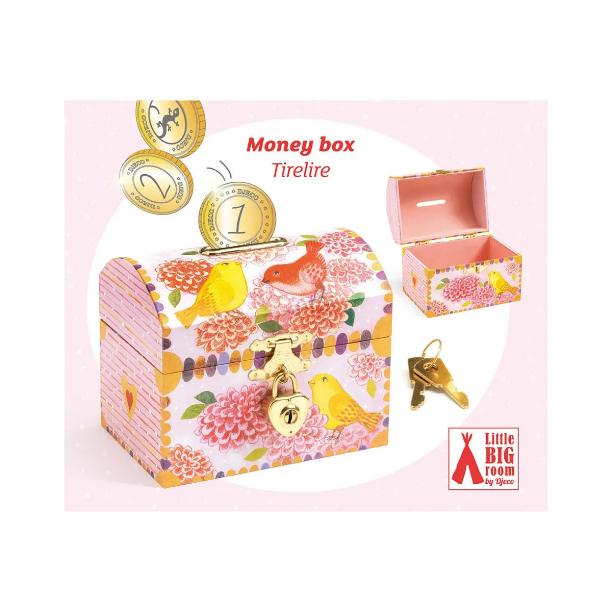 - Metal edge slot to deposit money, gold heart-shaped padlock with two keys, birds illustration