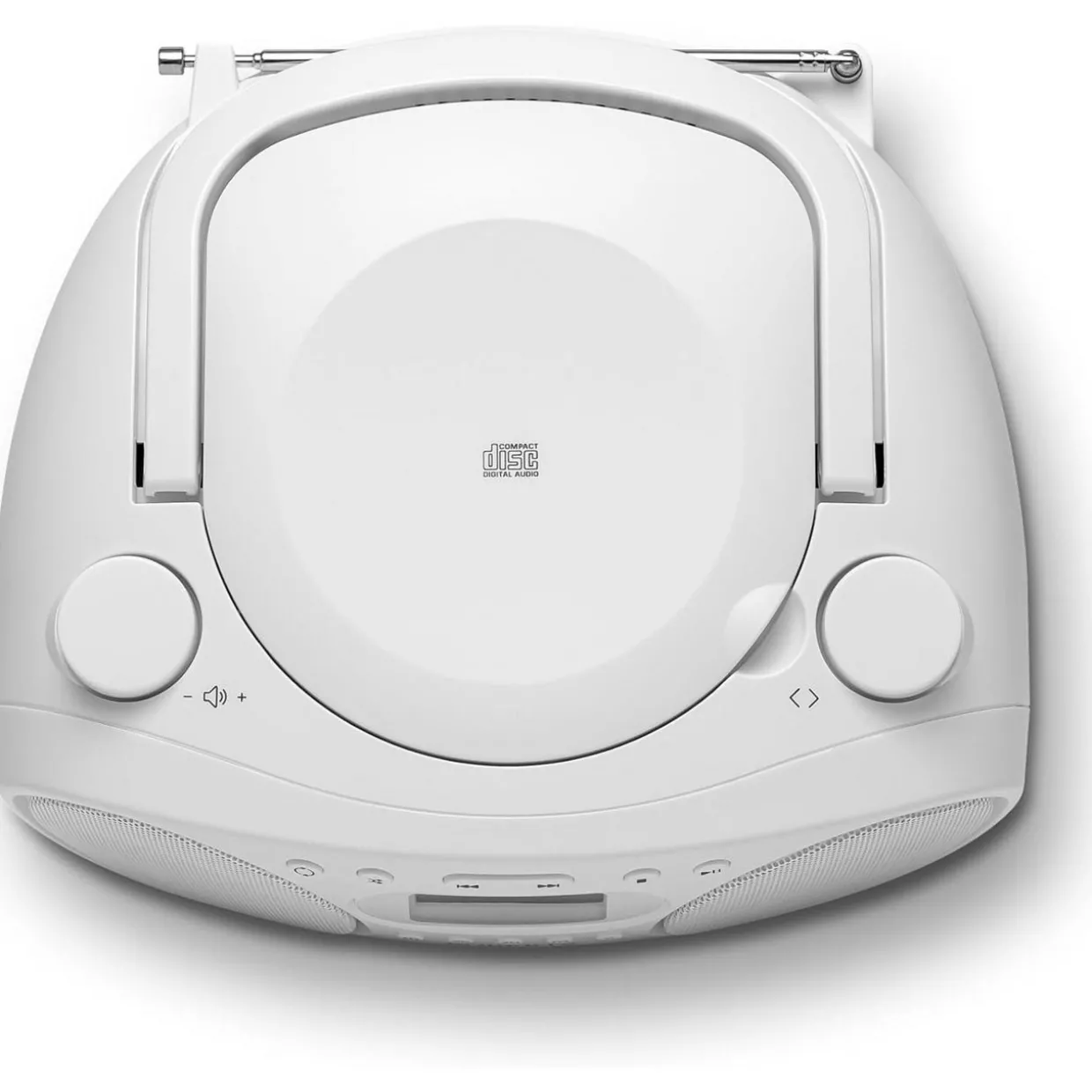 A simple and intuitive portable FM/AM radio boombox housed in a sleek portable design with CD player, headphone socket and dual speakers for clear stereo sound.