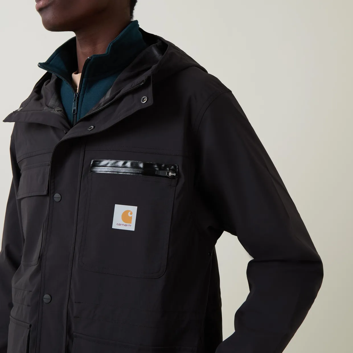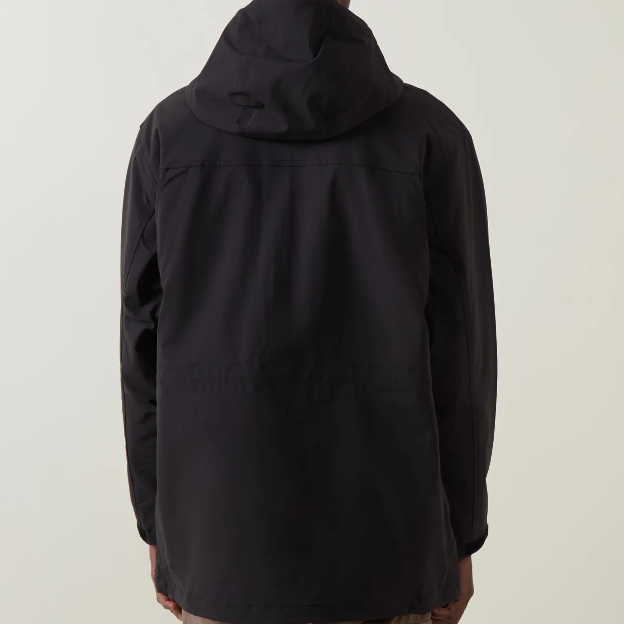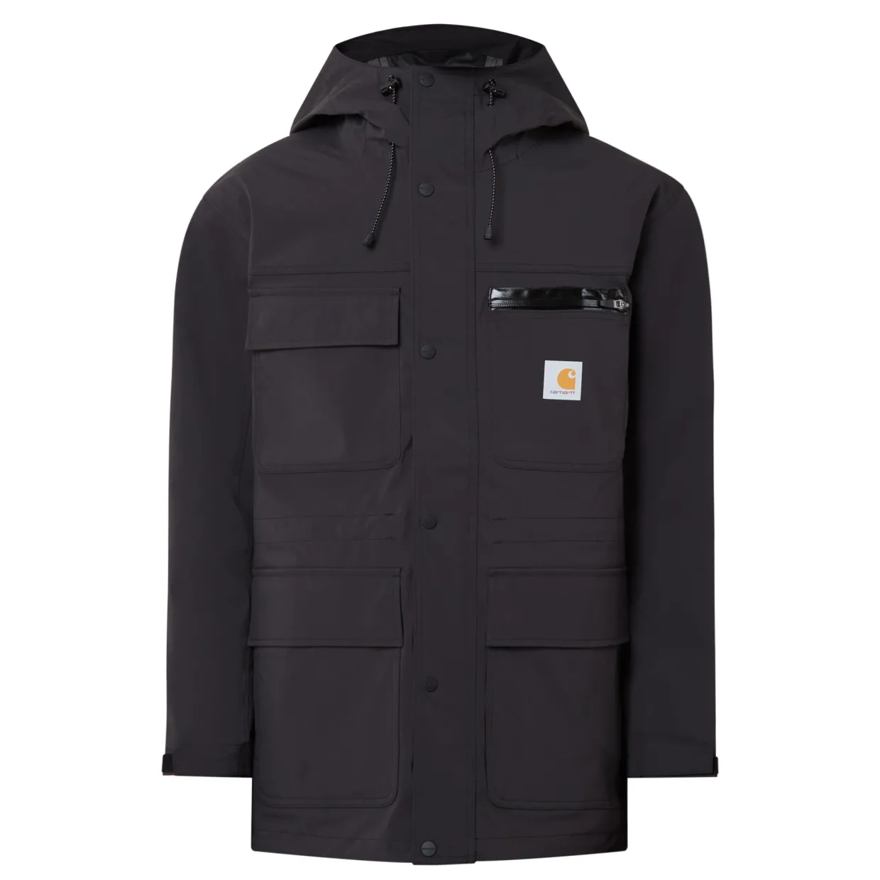 - Waterproof, seam-sealed, adjustable drawstring hood, adjustable cuffs, waistband and hem, front closure with hidden two-way zip and concealed snap-button closure, two chest pockets (one with zip closure), two lower patch pockets with concealed snap-button closure, square logo label