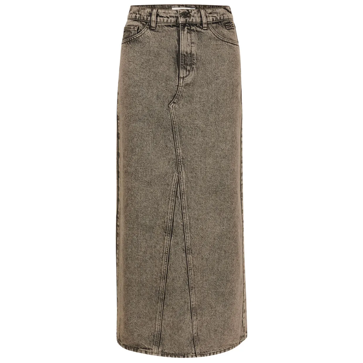 - Denim finish, regular waistband, straight silhouette, belt loops, five-pocket style, maxi length