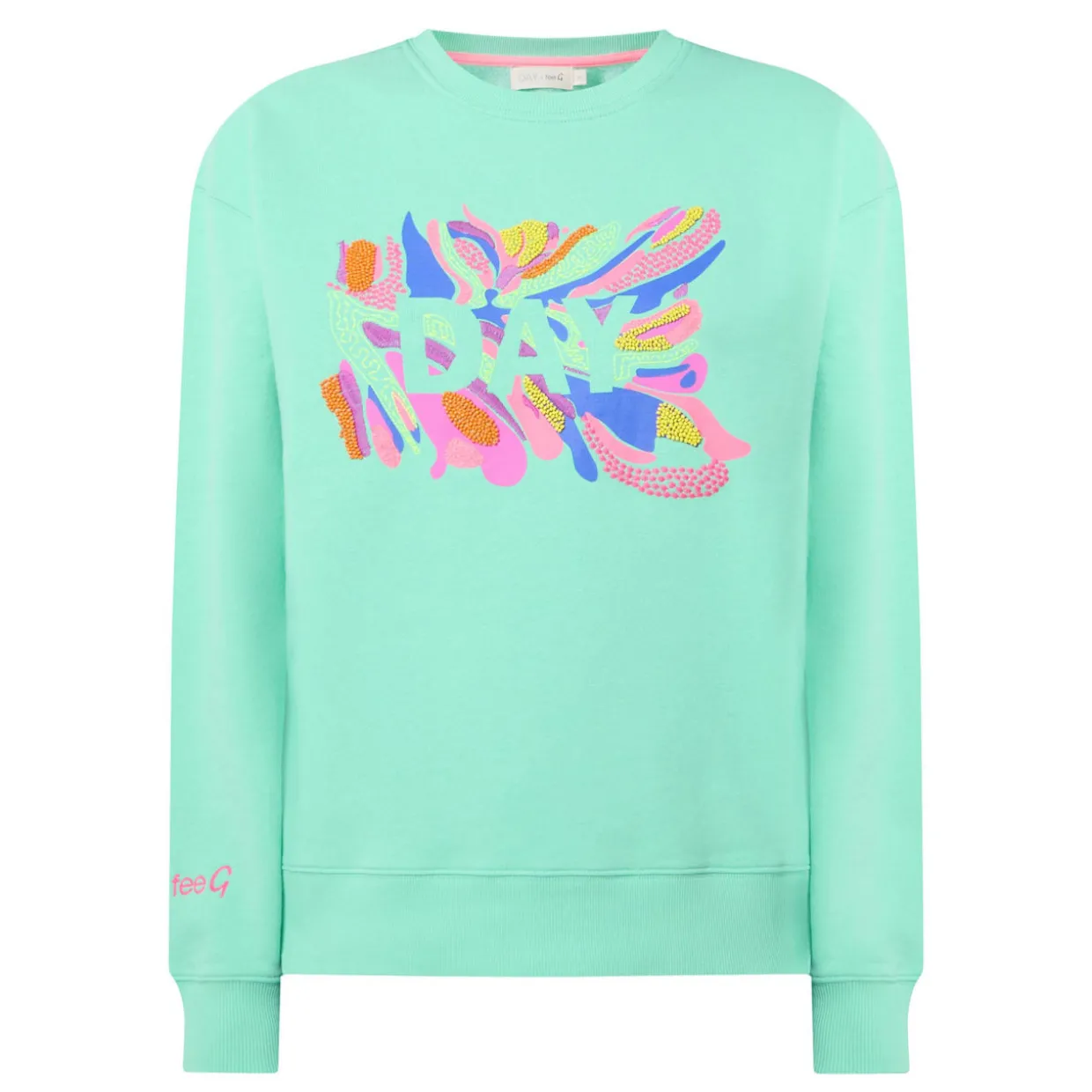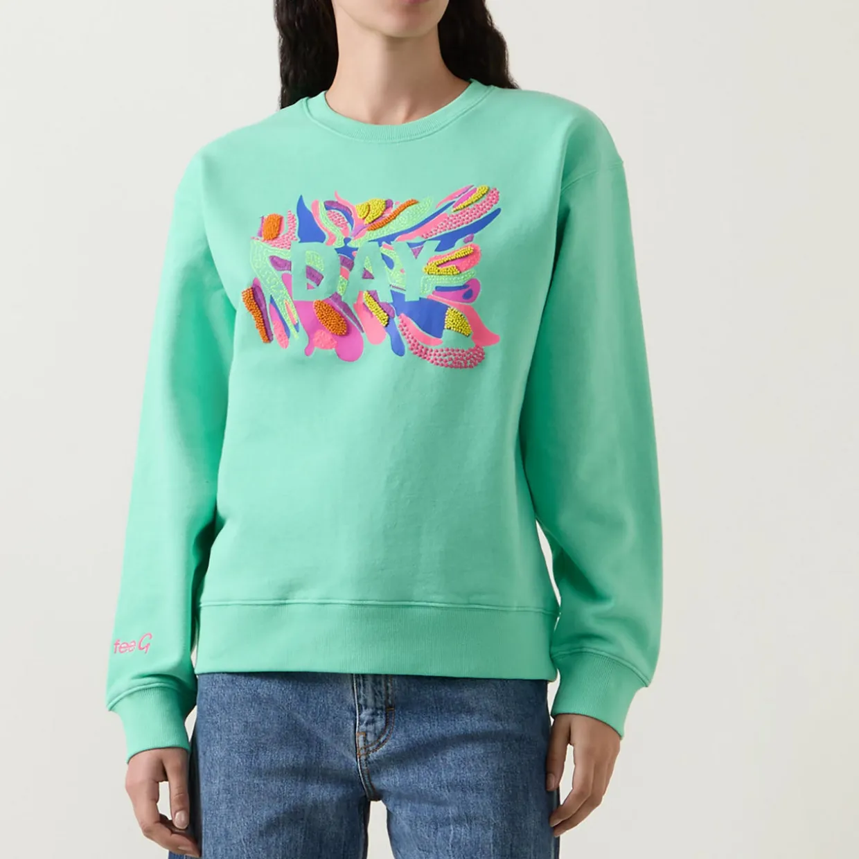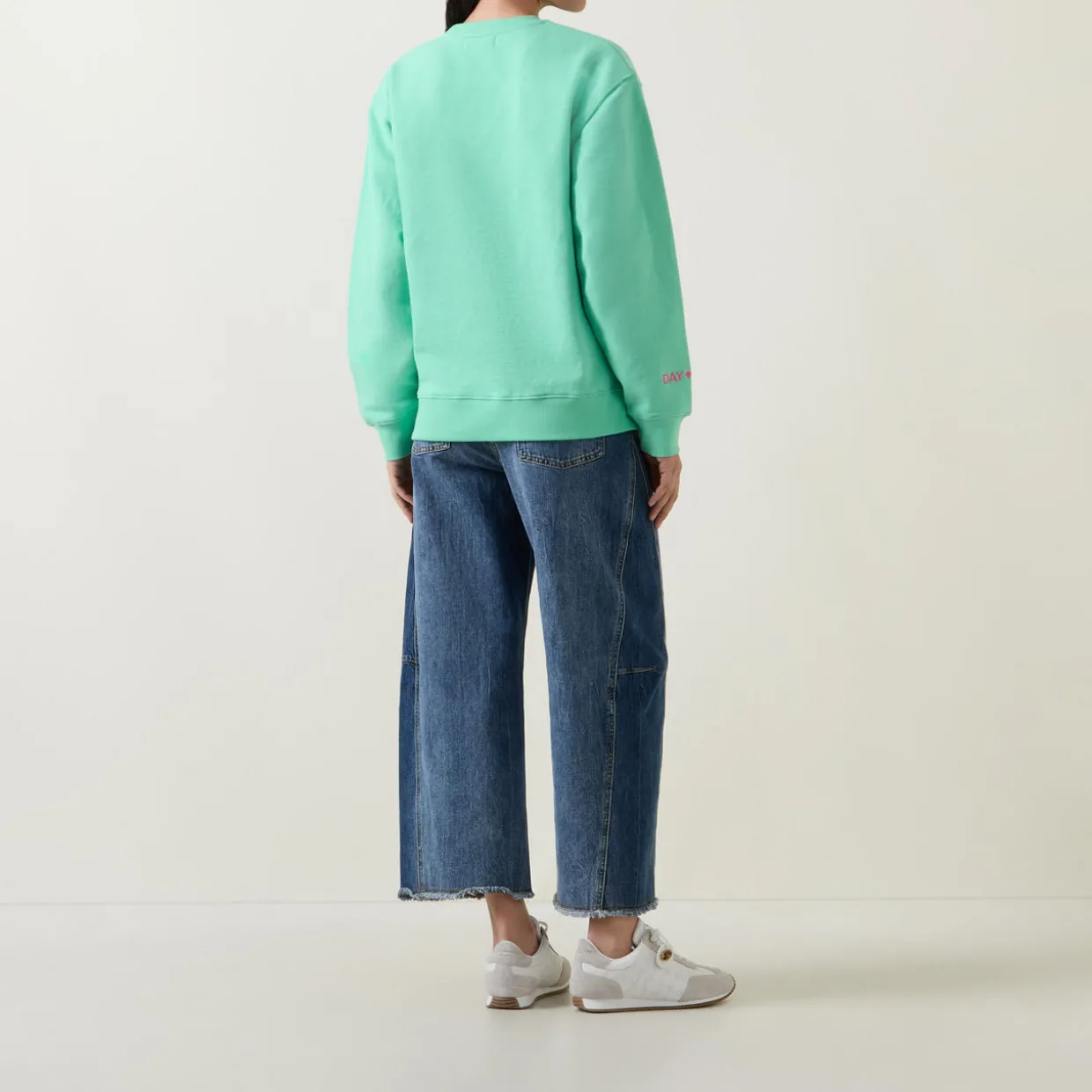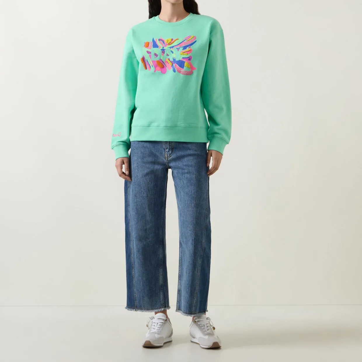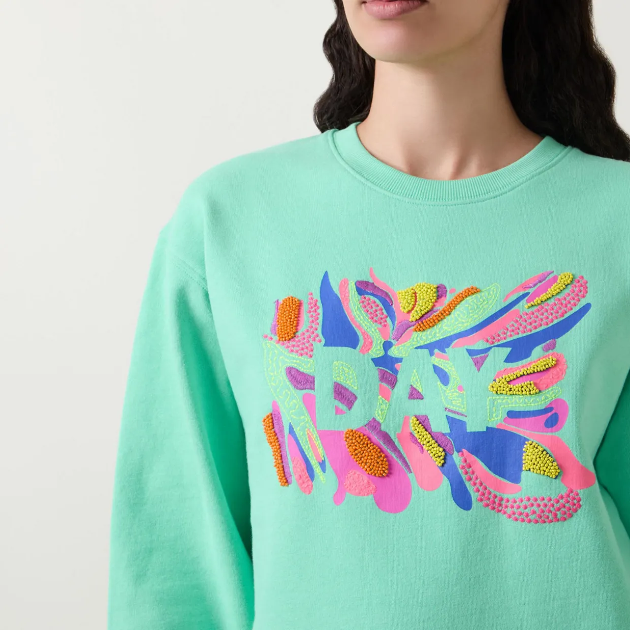 - Burst logo, crew neckline, long sleeves, straight hemline, ribbed trims