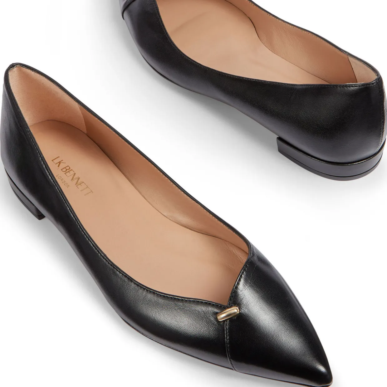 - Nappa leather finish, pointed toe, asymmetric cut, gold-tone nugget detail, flat leather heel, slip-on stop