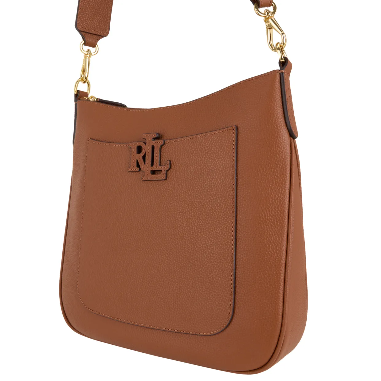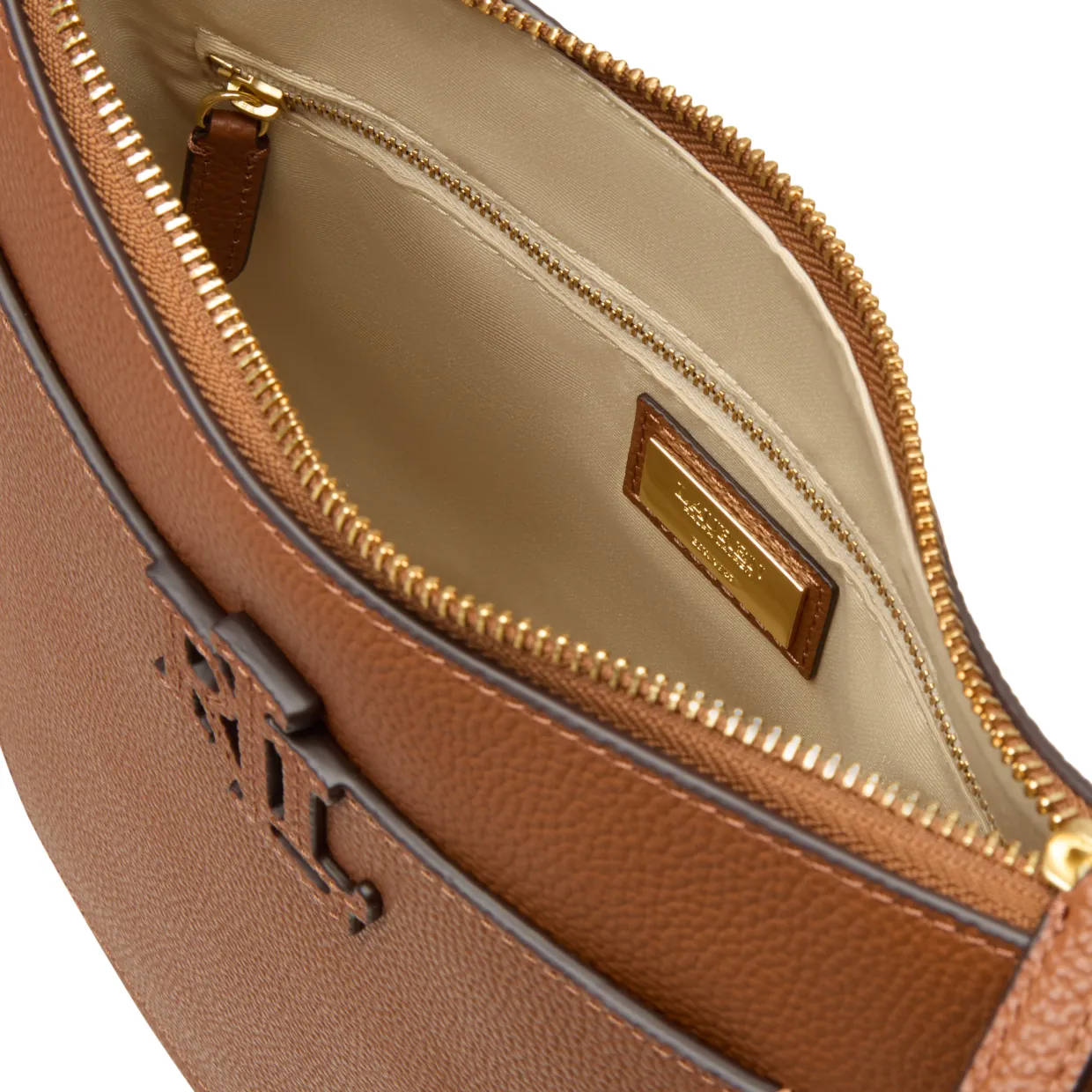 - Top zip fastening, adjustable webbed crossbody strap, external slip pocket, gold-tone hardware, stacked leather logo design, tonal stitching, pebbled leather finish