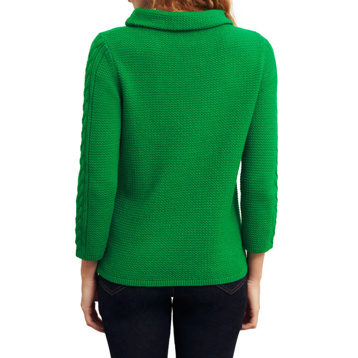 - Rolled boat neckline, three-quarter length sleeves, textured cable-knit detailing, straight hem, soft finish