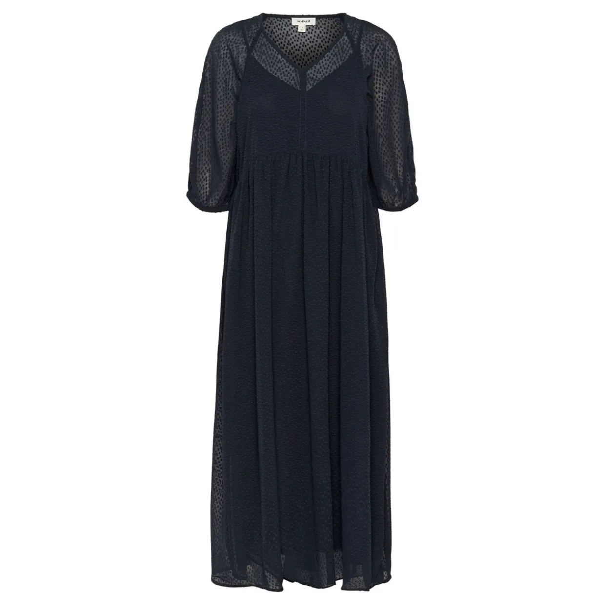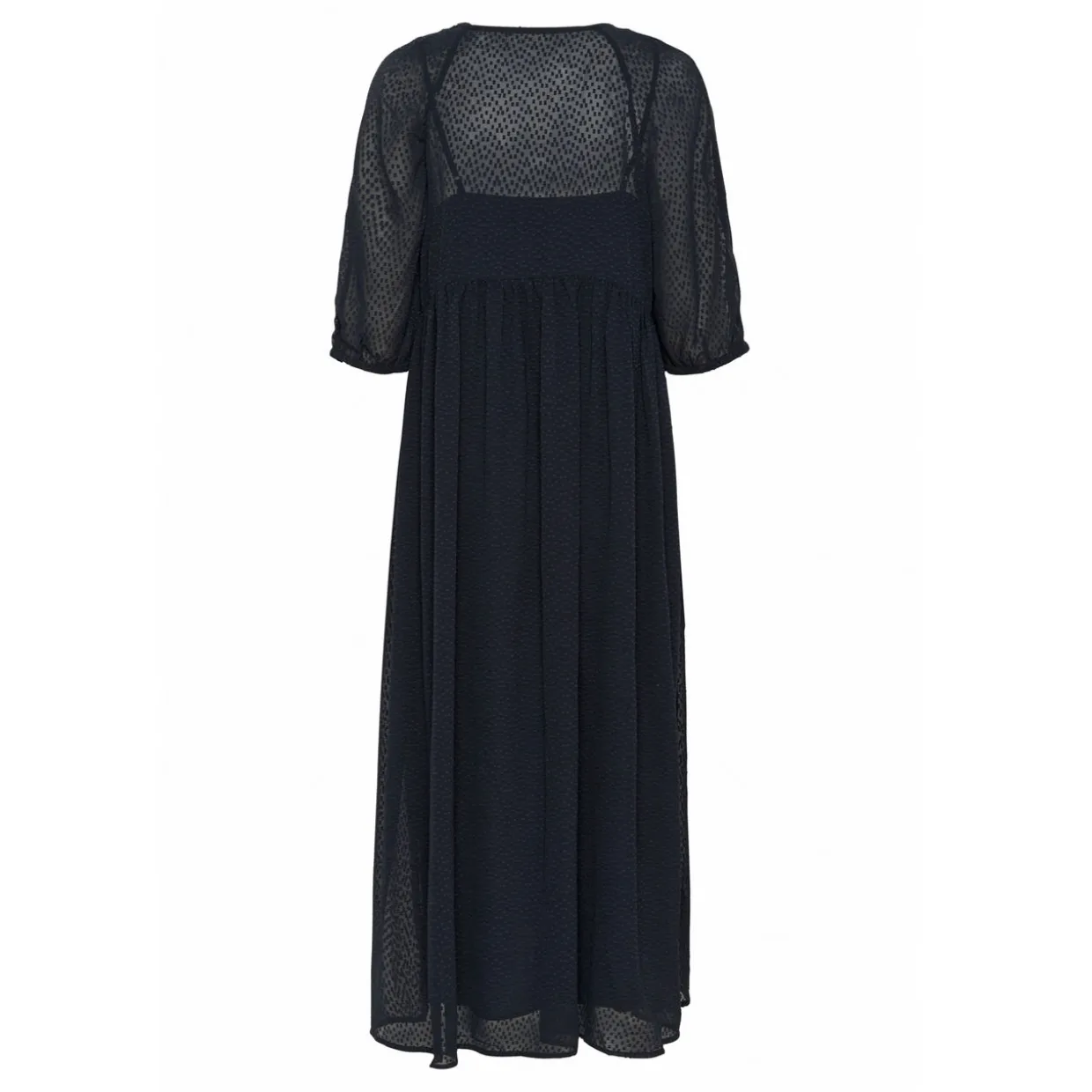 - Maxi length, woven, flowing silhouette, three-quarter-length sleeves, V-neckline