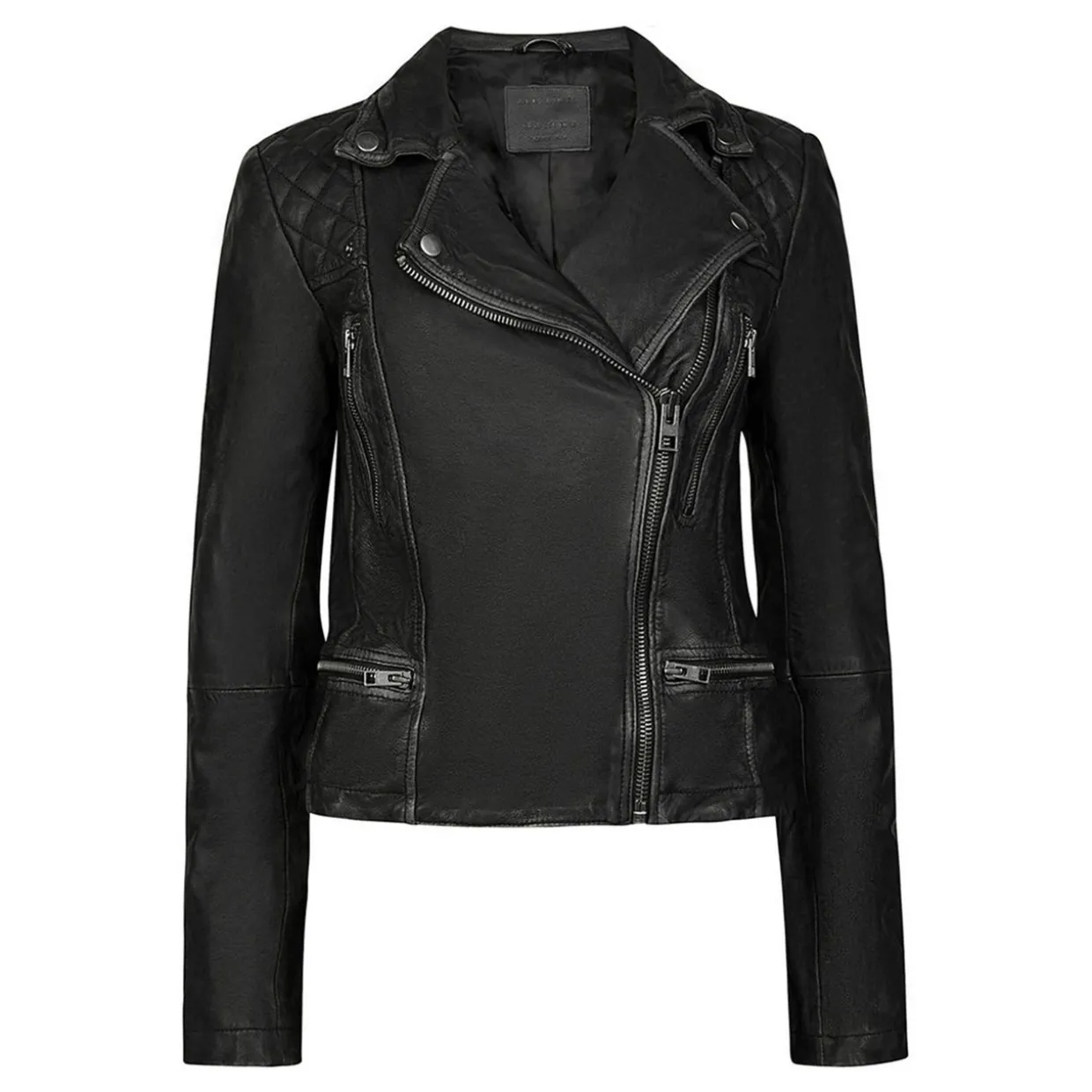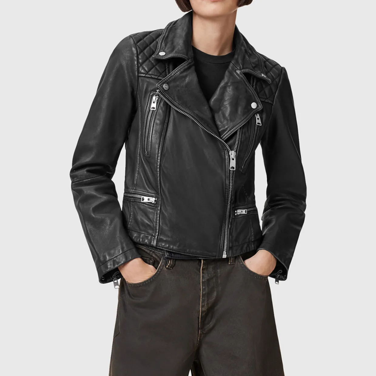 - Leather, distressed detailing, worn-in finish, retro-inspired quilted shoulder panels, signature gunmetal hardware, quilting to the shoulders, creased finish, two lower zip pockets, tab fastening, zip cuffs, long sleeves, asymmetric zip fastening, lined