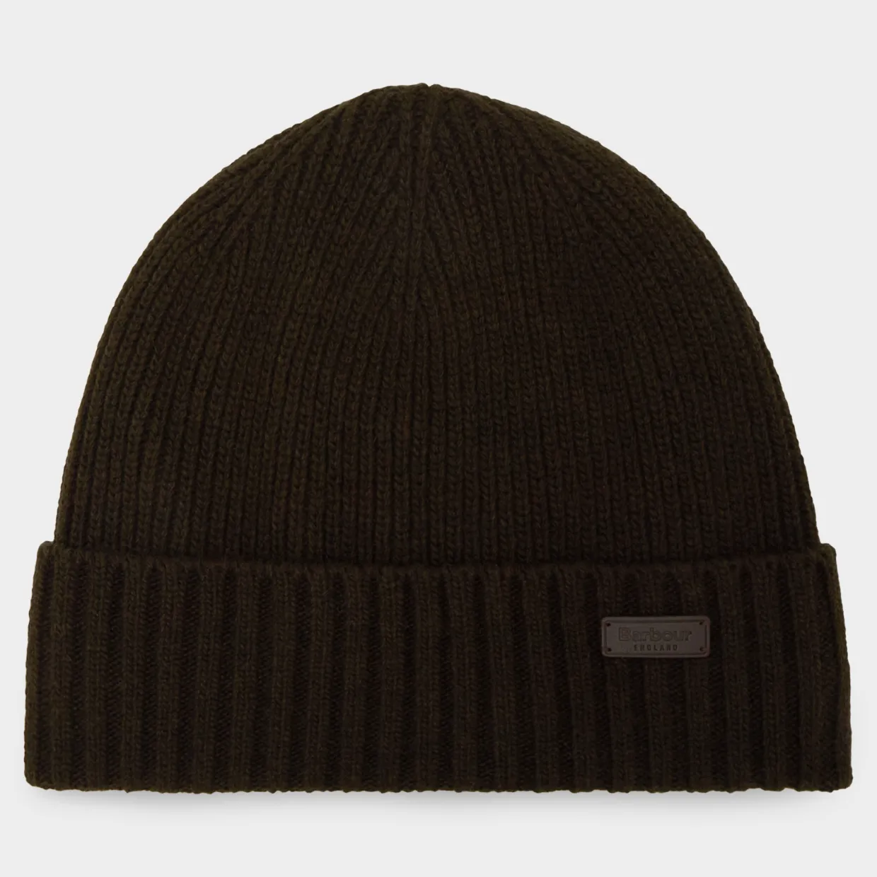 - Beanie style, rib knit structure, logo badge, turned-up brim