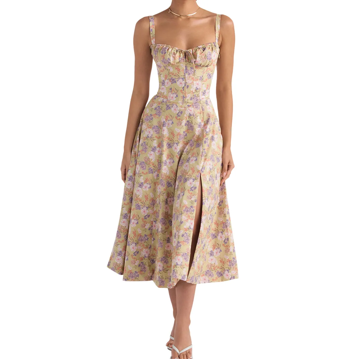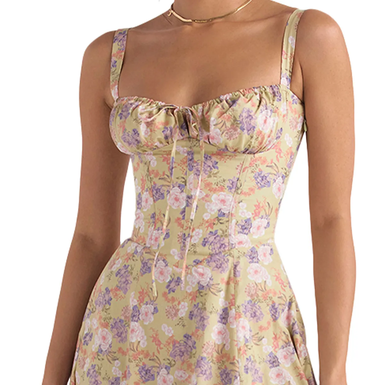 - Stretch cotton, floral print, corseted bodice, lace up back, gathered bust with drawstring tie, side split