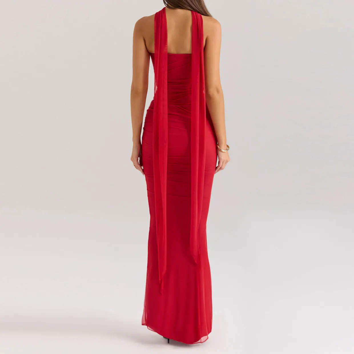 - Maxi length, fluted hem, ruched upper, zip fastening