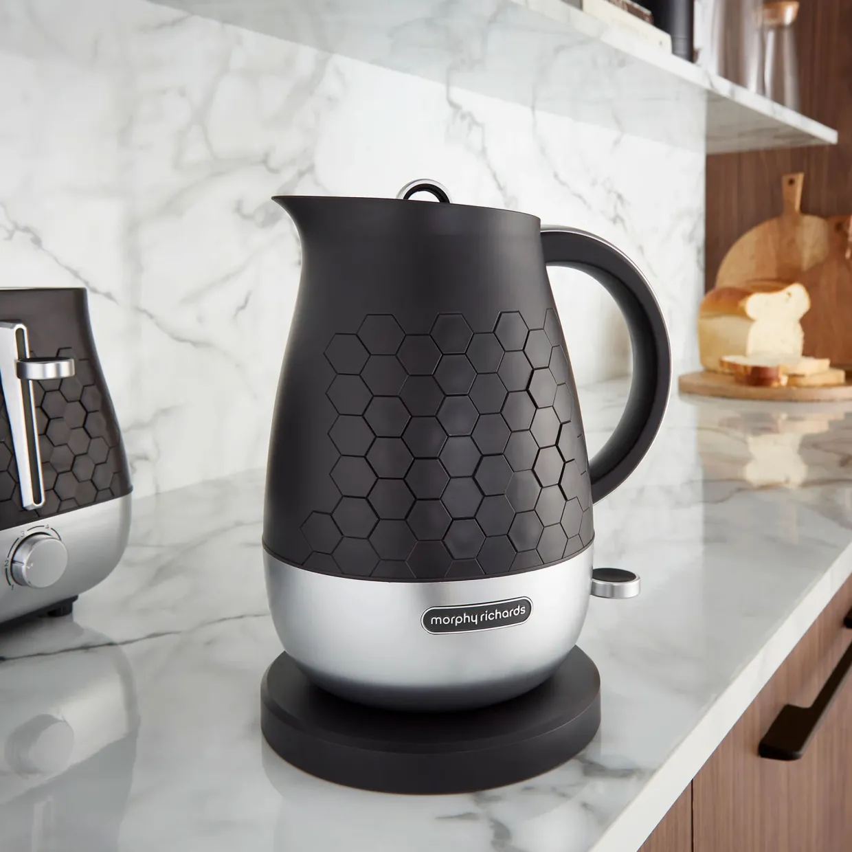 Discover the Morphy Richards Cassini 1.7L Jug Kettle! Boasting a sleek design with efficient functionality, this modern kettle delivers a standout choice for any kitchen. The Cassini range features a distinctive hexagonal design across the kettle, toaster, and microwave, creating a cohesive and modern aesthetic for your kitchen. The jug kettle offers a generous 1.7L capacity and powerful 3kW rapid boil element meaning this electric kettle quickly heats water for multiple cups, saving you time. The carefully designed spout ensures a smooth, splash-free pour every time, while the 360-degree base allows you to place the kettle back onto the base from any angle, perfect for left- or right-handed users!