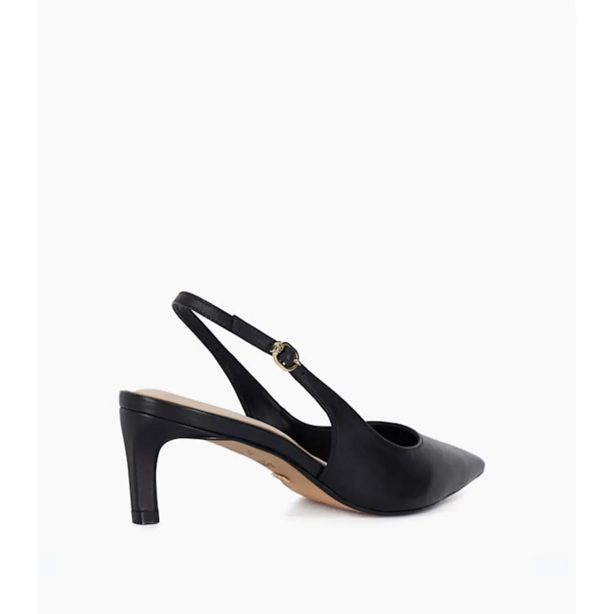 - Pointed toe, stiletto heel, slingback silhouette, branded buckle fastening, gold-tone hardware, smooth leather finish