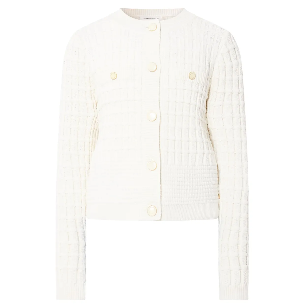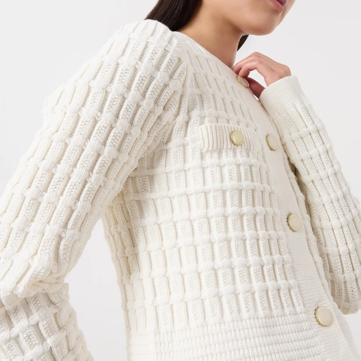 - Textured, long sleeves, crew neckline, button fastenings, ribbed trims