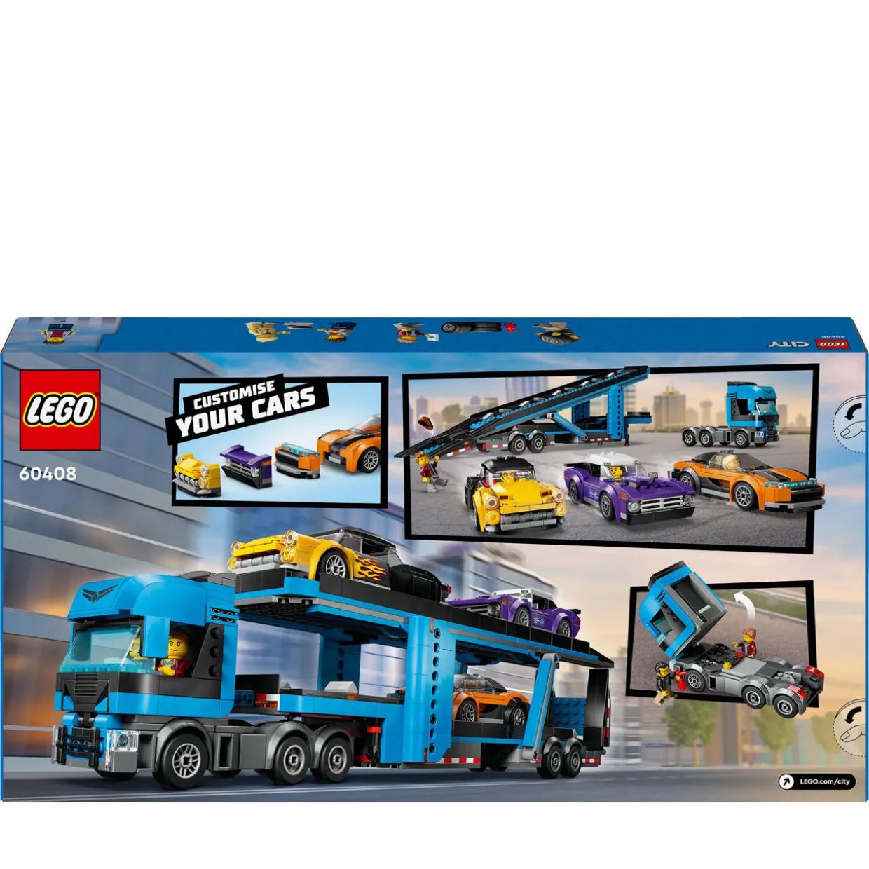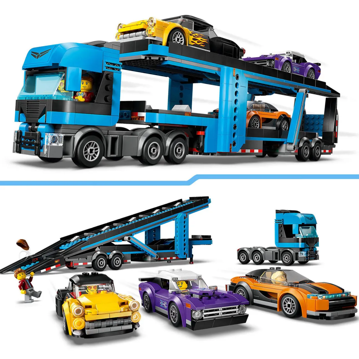- 998 pieces, double-decker transporter toy truck with trailer, ’50s-style tail dragger car, ’70s-style muscle car, modern electric car model, 4 minifigures, vehicle accessories, toy medic kit, fire extinguisher