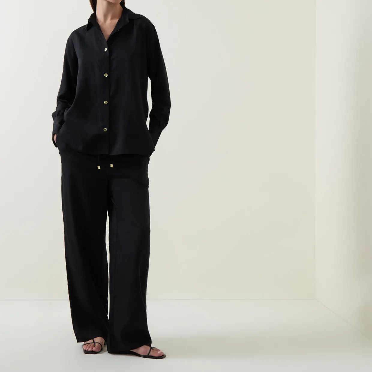 - Elasticated drawstring waistband, high-rise, two side in-seam pockets, wide-cut leg, smooth fabric