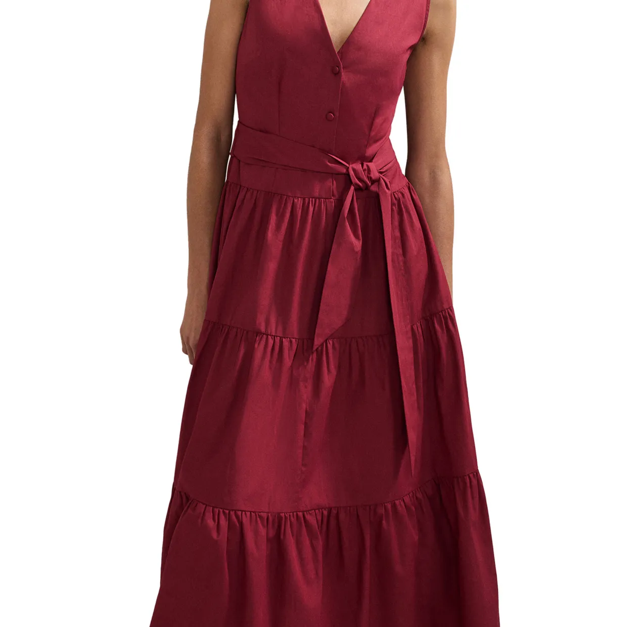 - Midi length, structured bodice, tiered skirt, button fastenings, sleeveless