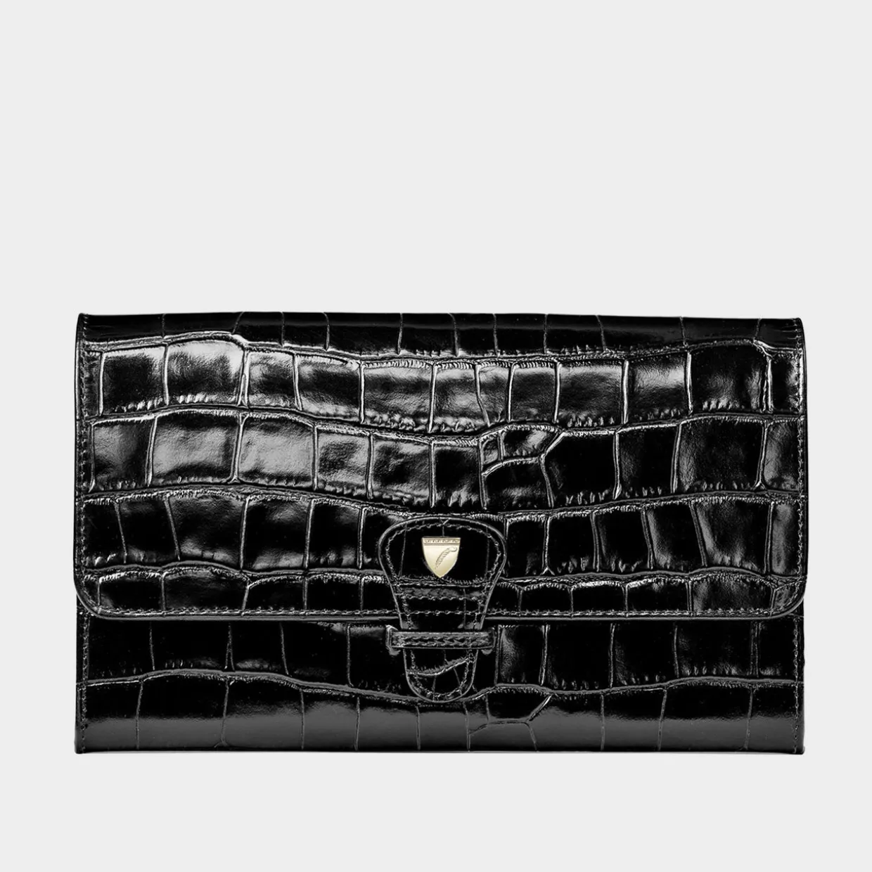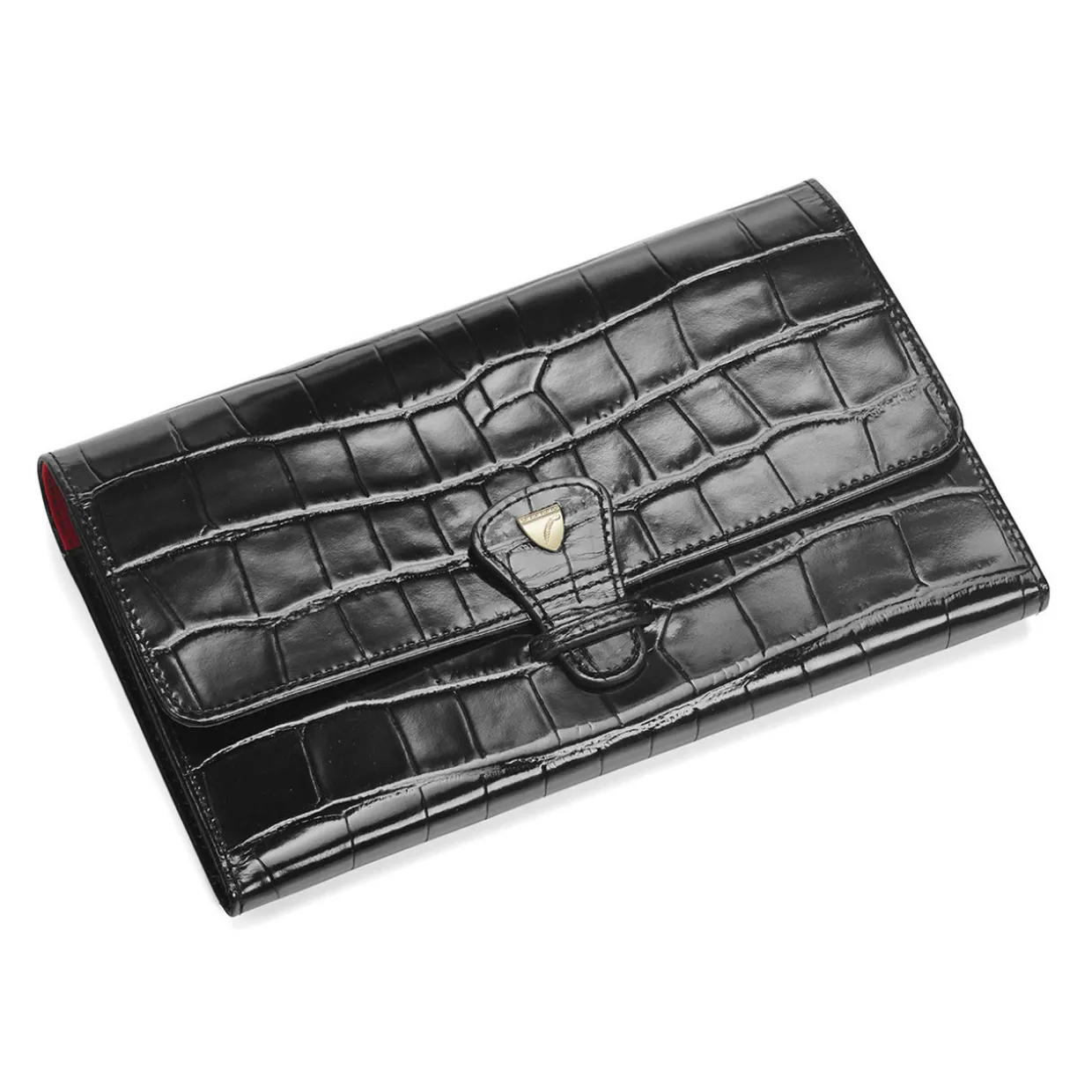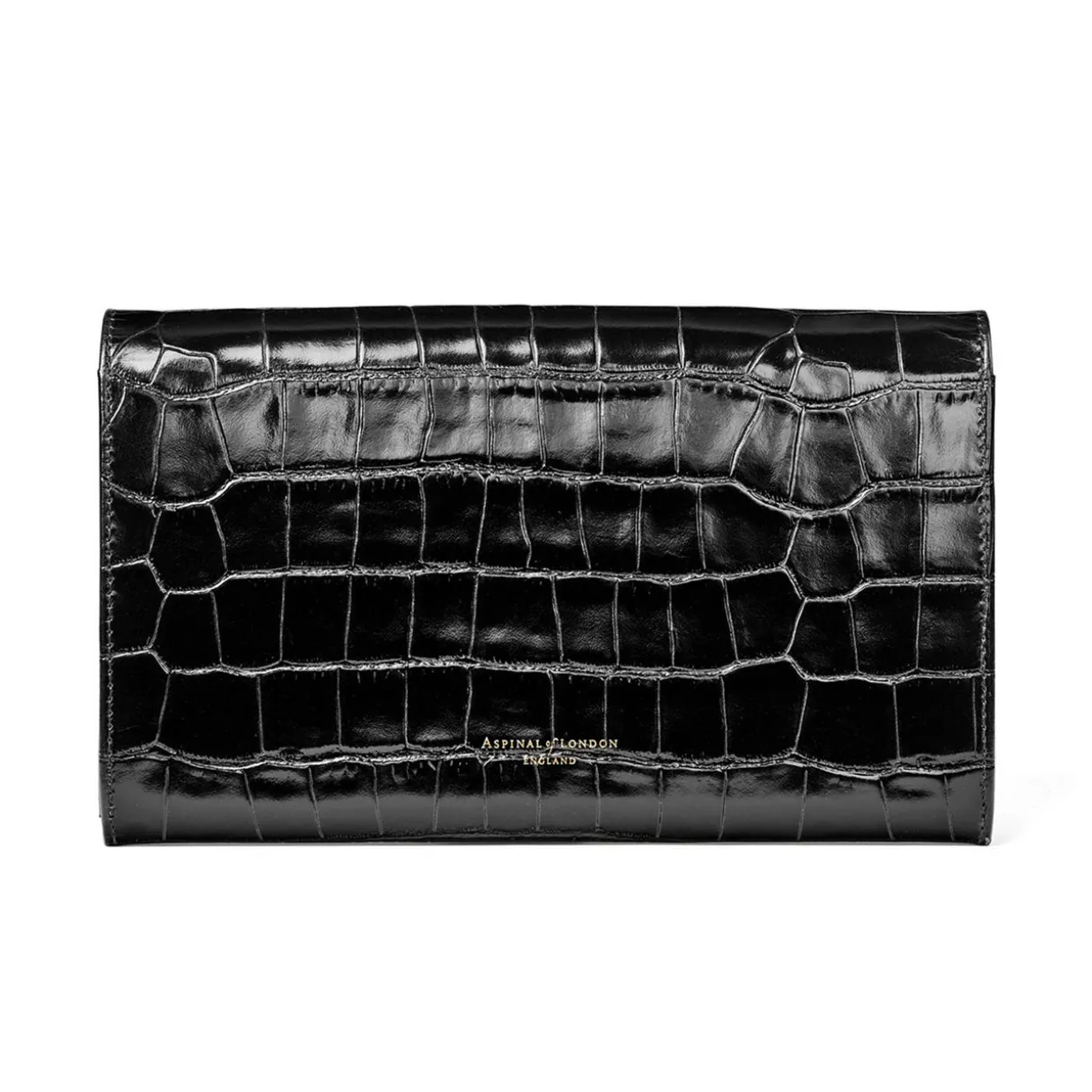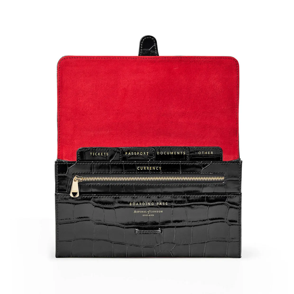 - Flap with loop fastening, one front slip pocket, one pocket with zip fastening, detachable divider compartments for tickets, passports and boarding passes, signature hardware, debossed logo lettering, croc-embossed textured finish, tonal stitching, suede lined