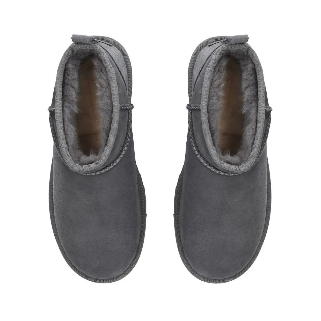 - Flat sole, shearling lined, flexible sole, pull-on style, round toe, branded