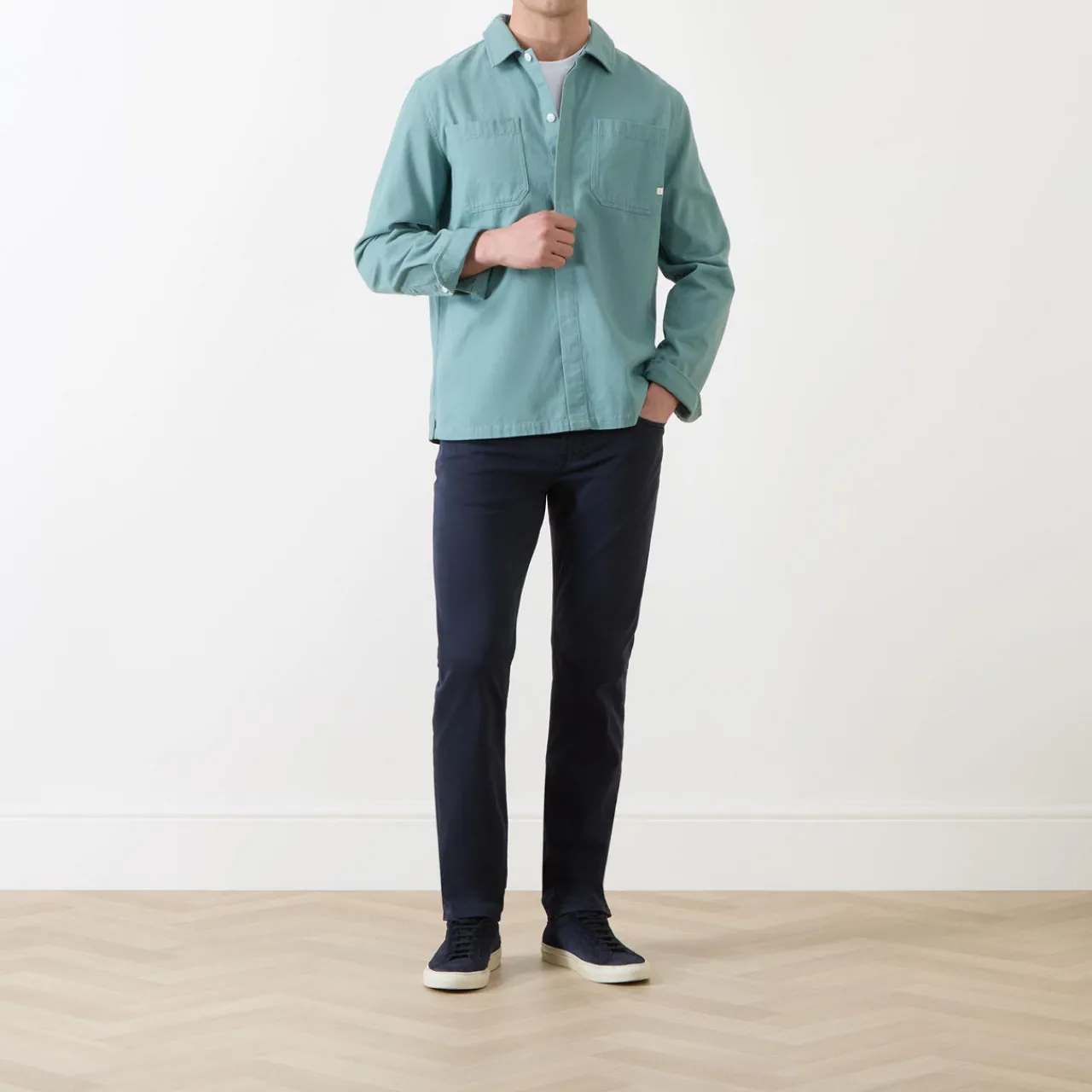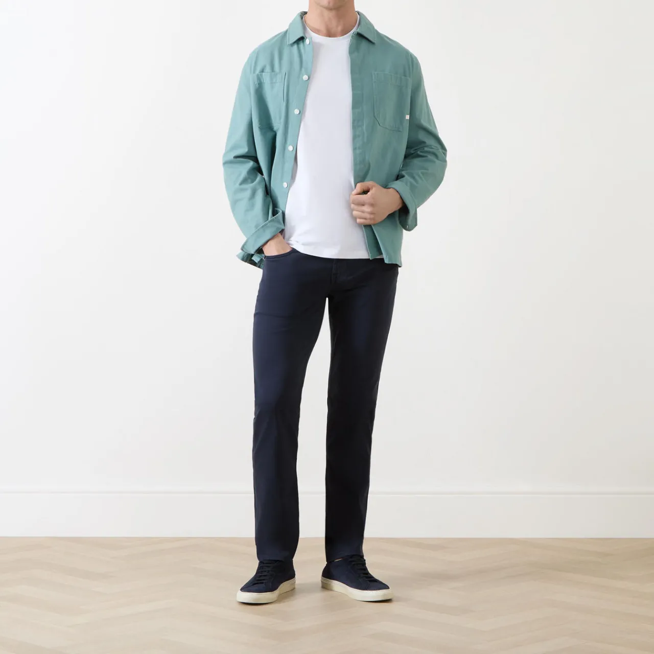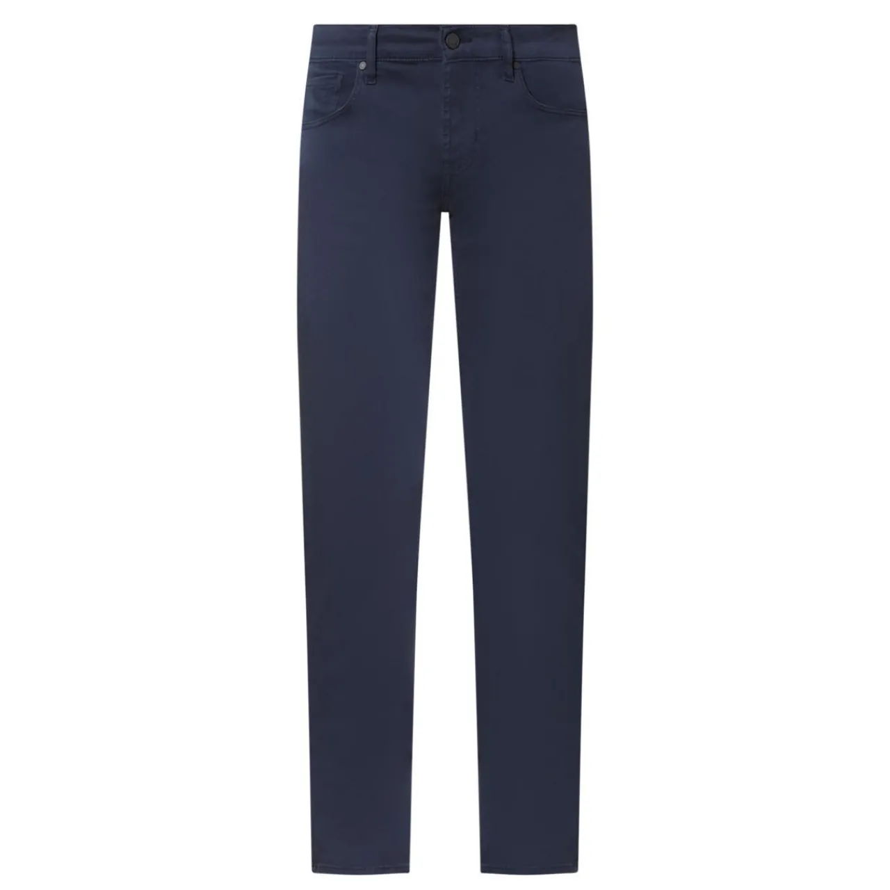 - Mid-rise, slim leg, belt loops, concealed fly and button fastening, five-pocket styling, clean hems, rear logo branding, stretch fabric