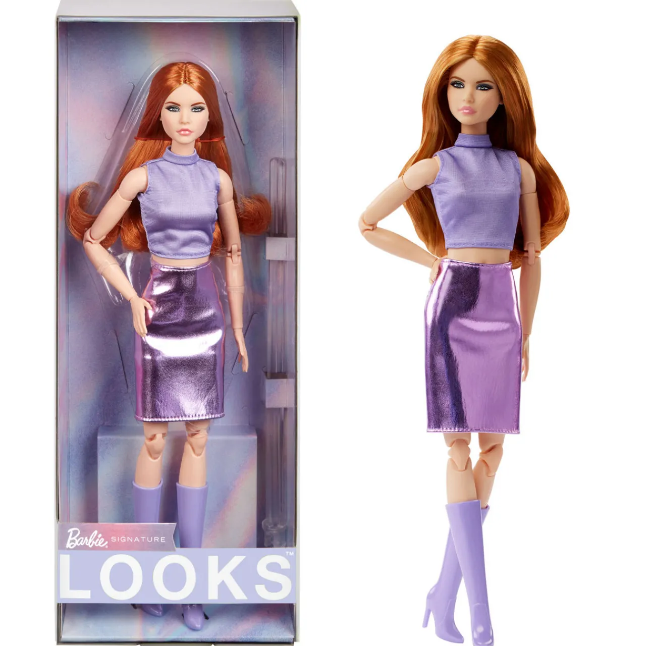 - Barbie Looks No.20 collectible doll, ‘Made To Move’ body, doll stand, ‘Certificate of Authenticity’, lavender tricot top, glossy faux-leather midi skirt, knee-high boots
