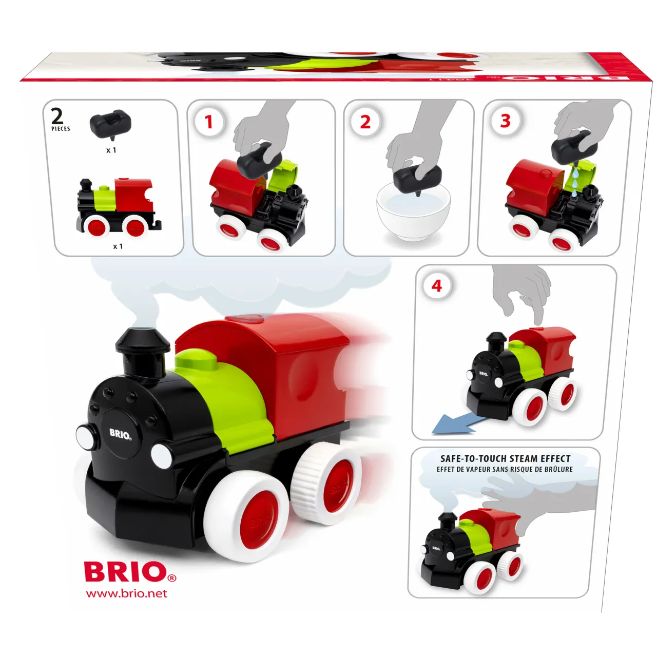 - One train, battery-powered push-and-go mechanism, safe-to-touch steam effects