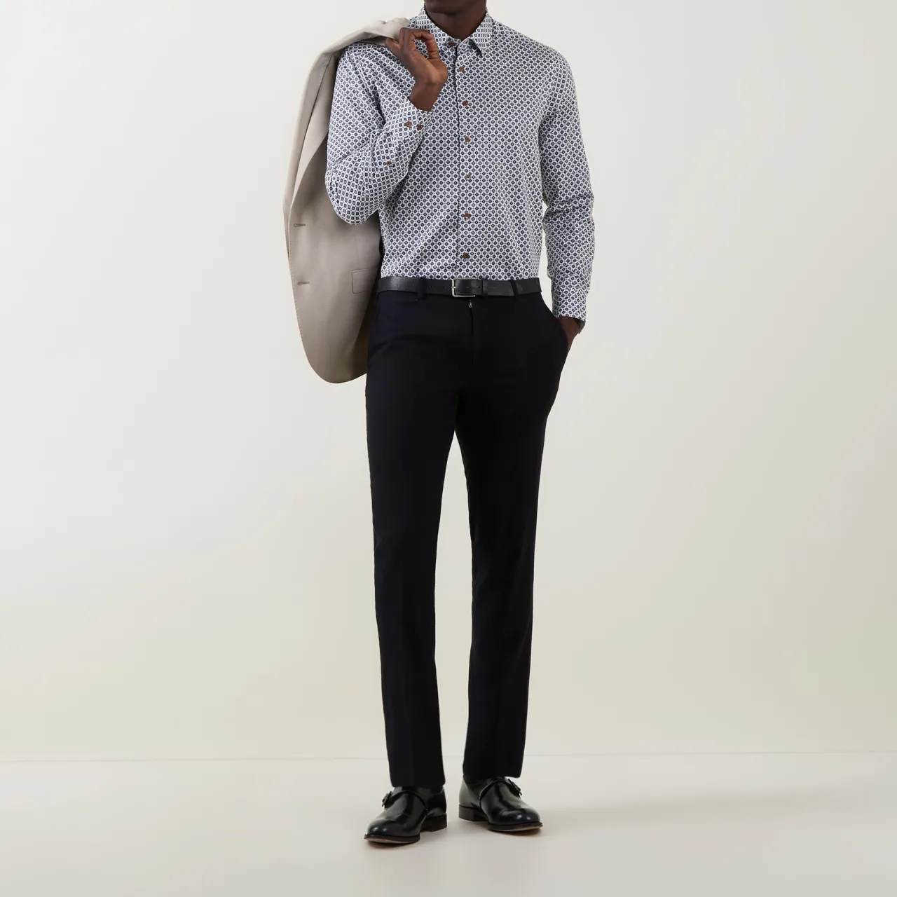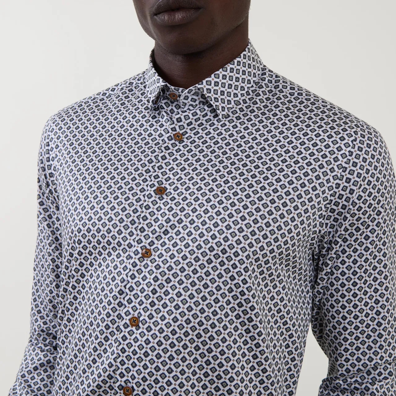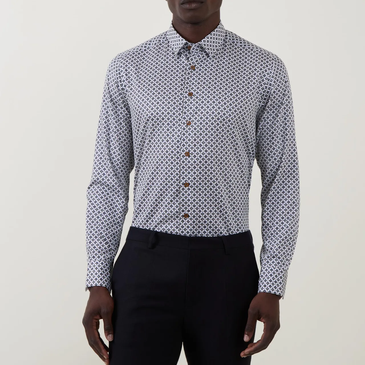 - Button-down collar, long sleeves, geometric pattern, button fastenings, curved hemline