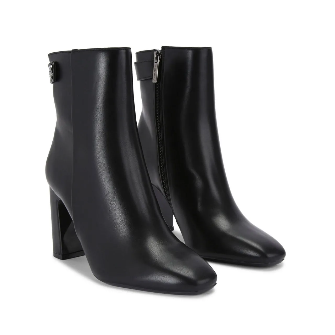 - Back ankle strap, gunmetal round stud with crystal embellishment, block heel, smooth finish, inside zip fastening, soft squared toe, All Day Long technology