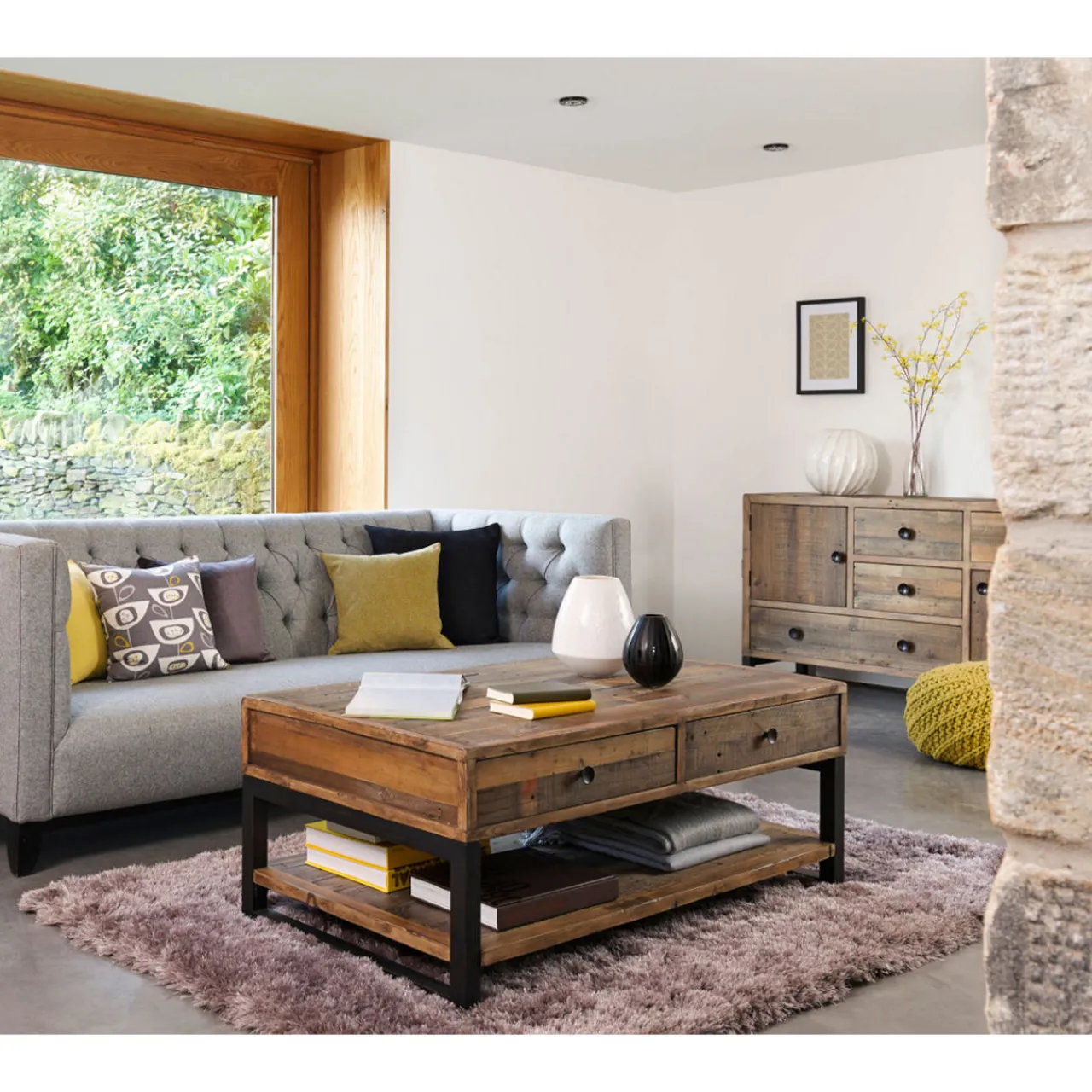 Delicately crafted from rustic reclaimed materials, the Ford range of dining furniture pairs an elegantly ornate sensibility with solid presence. Quietly contrasting the grain-heavy texture of the surfaces and the sleek black angles of metal frames, this is a quaint collection perfect as a lifestyle statement in any home.