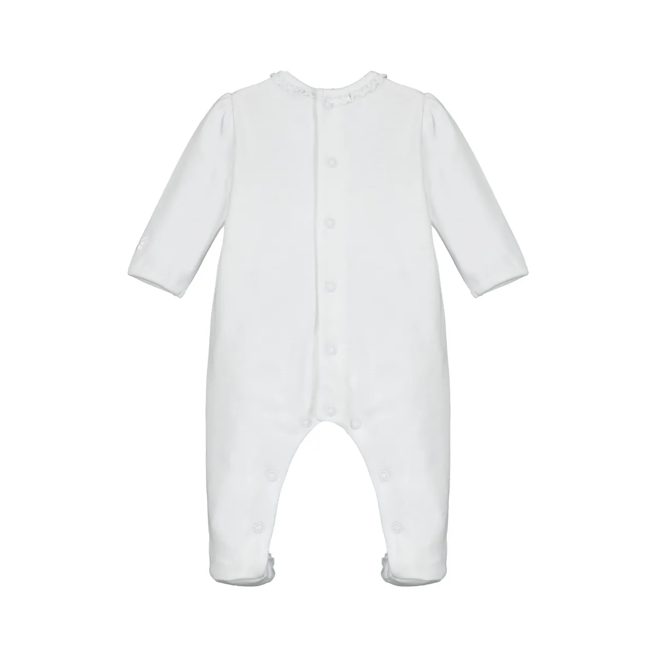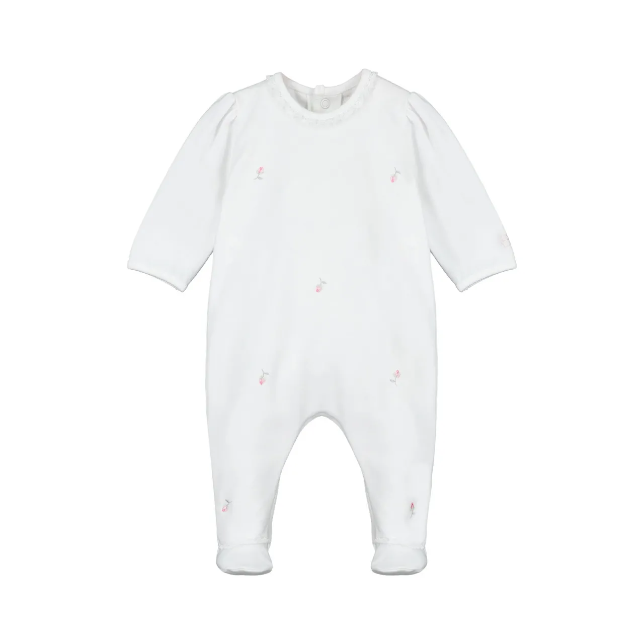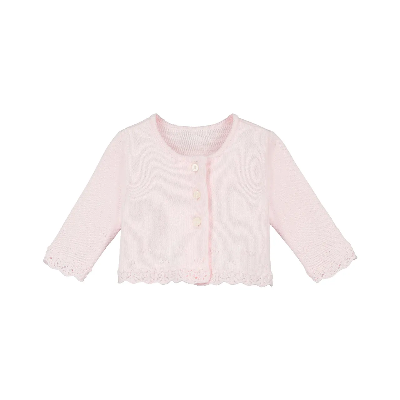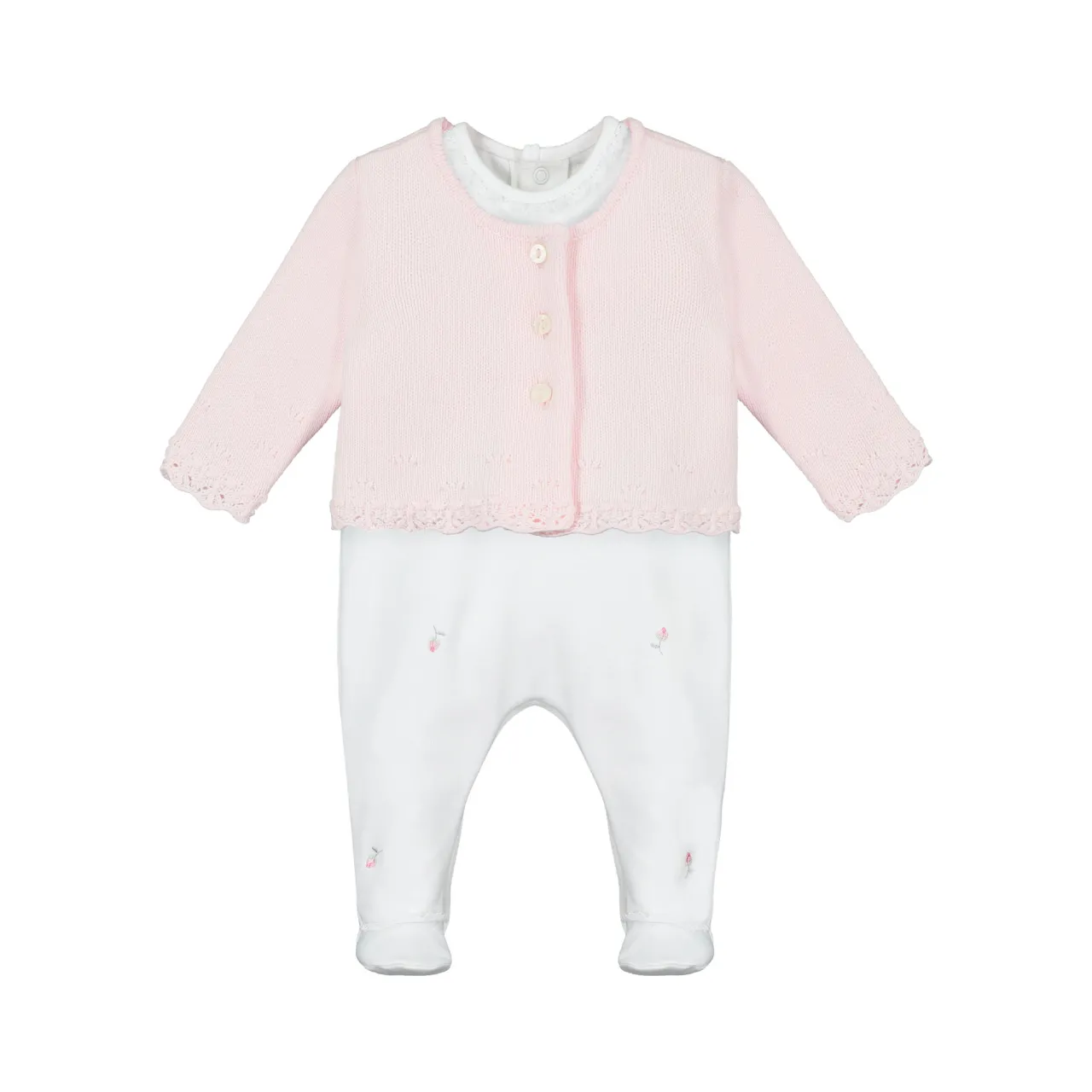 - Babygrow: Lace trim on neckline and ankles, rosebud embroidery details, snap button fastenings. Cardigan: Knitted, scalloped edge, bow details, button fastenings