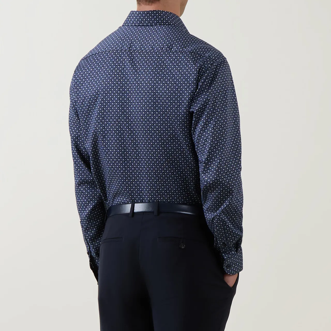 - Geometric print, pointed collar, long sleeves, single cuffs, button fastenings, curved hemline