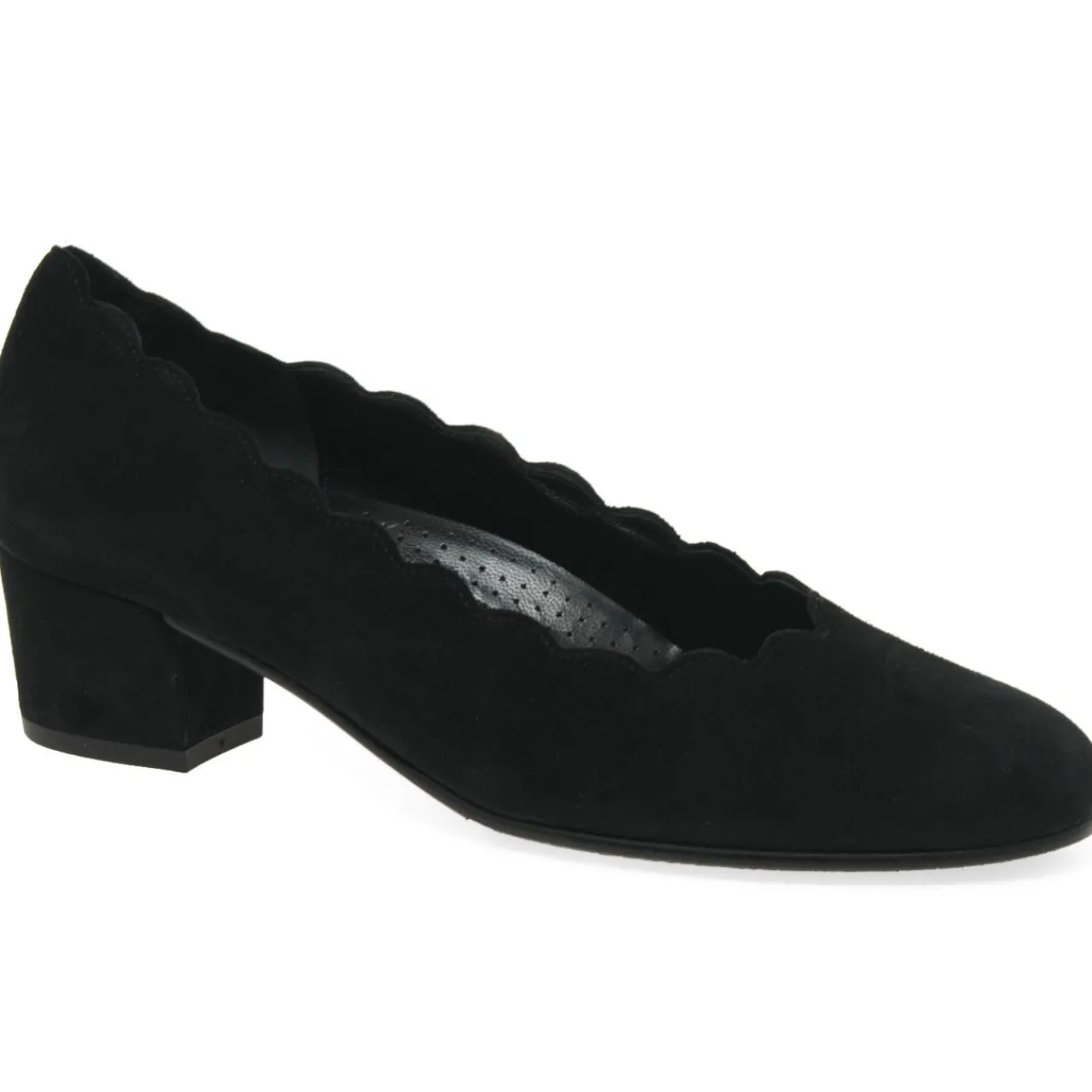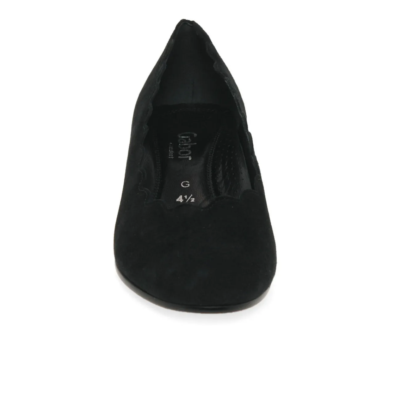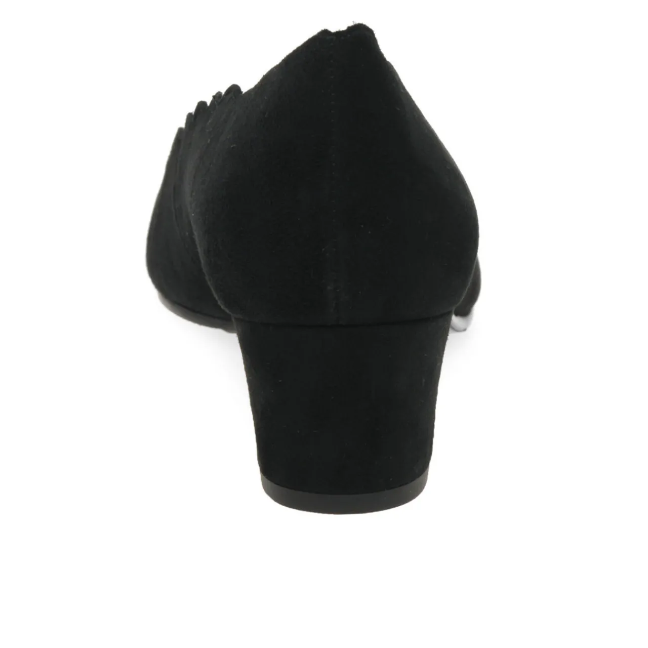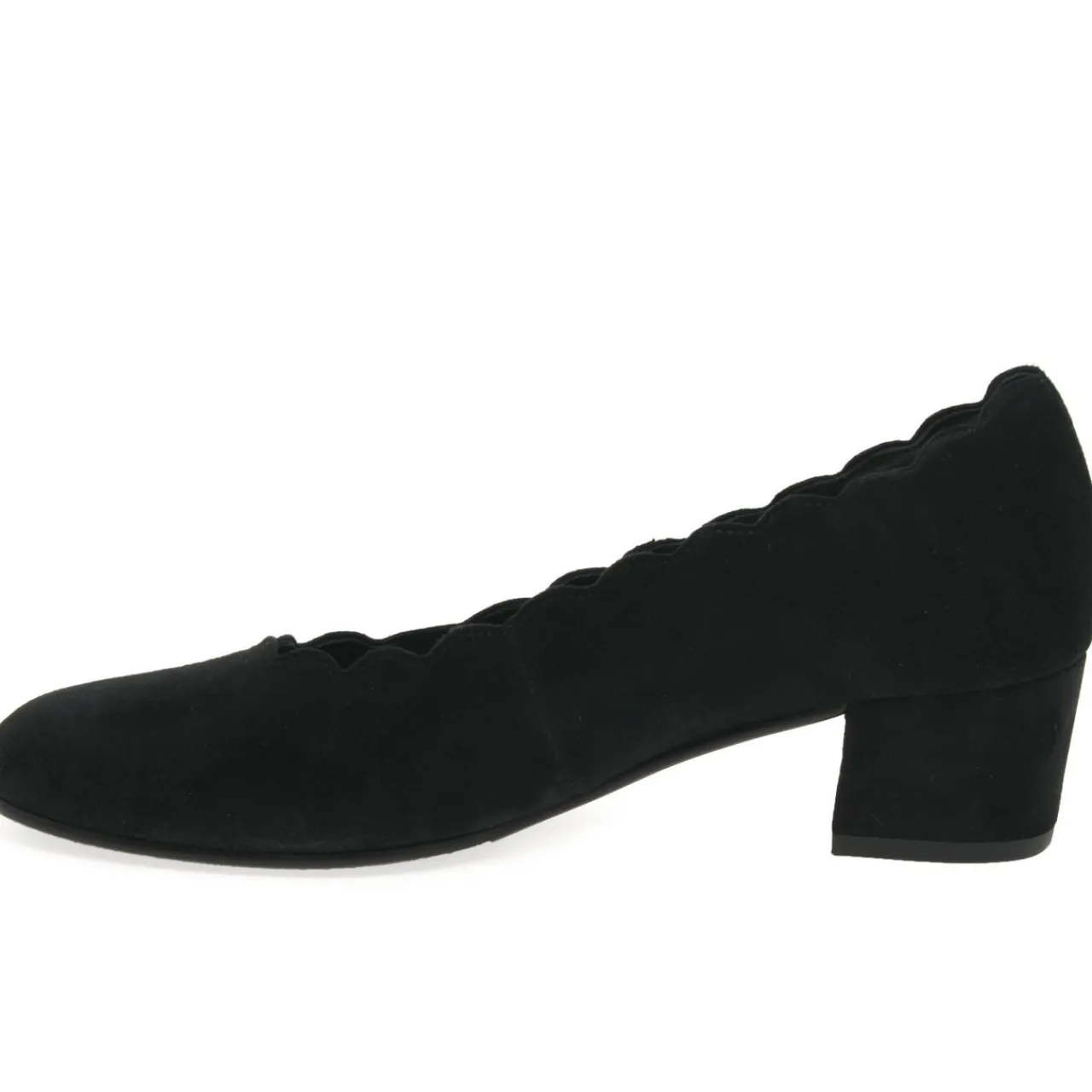 - Round toe, low vamp, slip-on style, block heel, scalloped trims