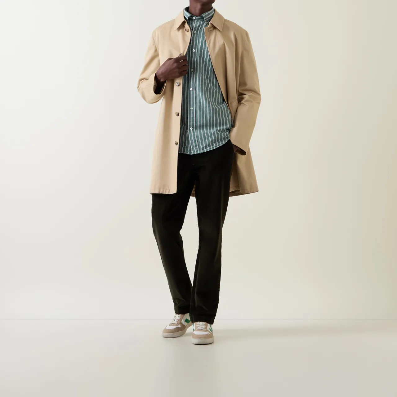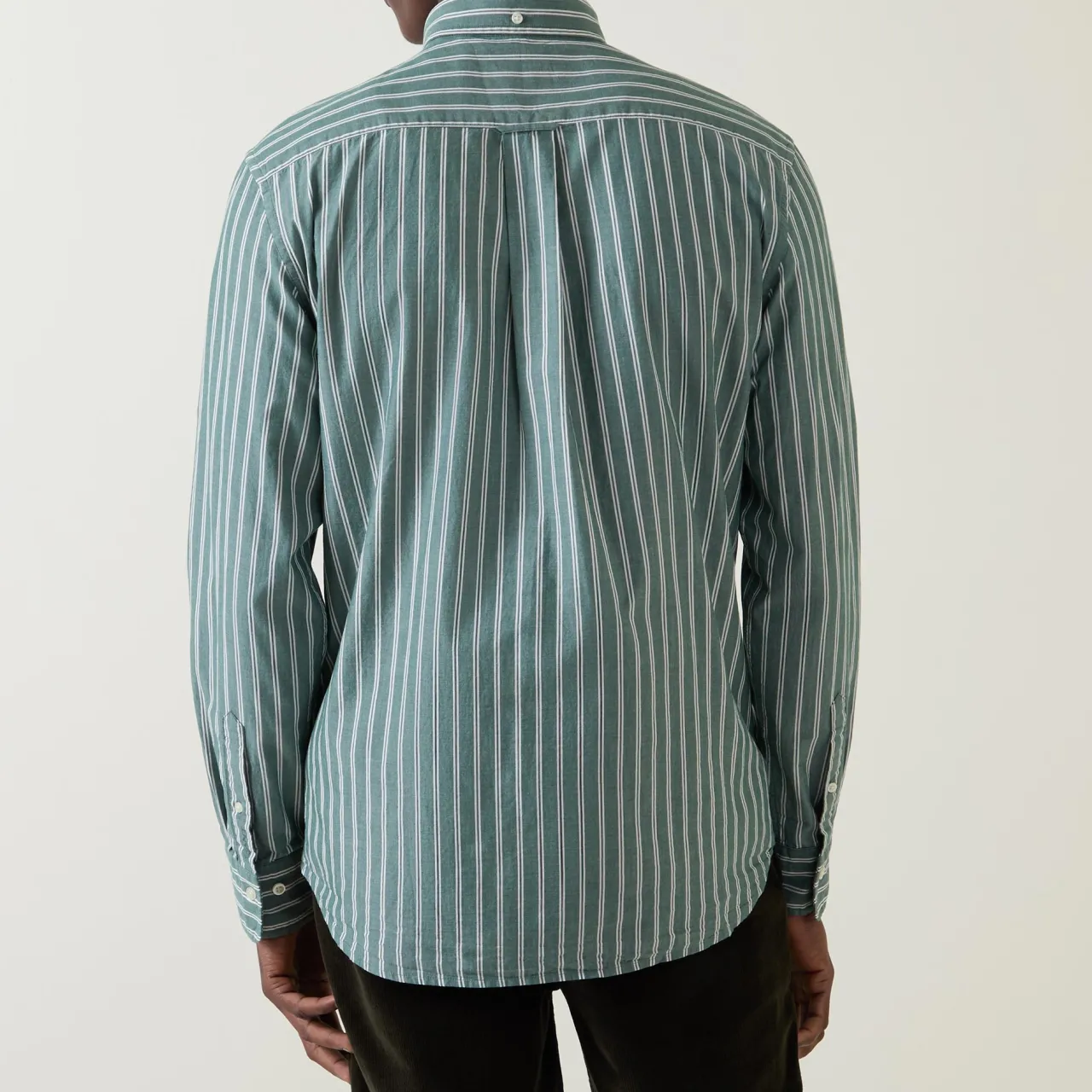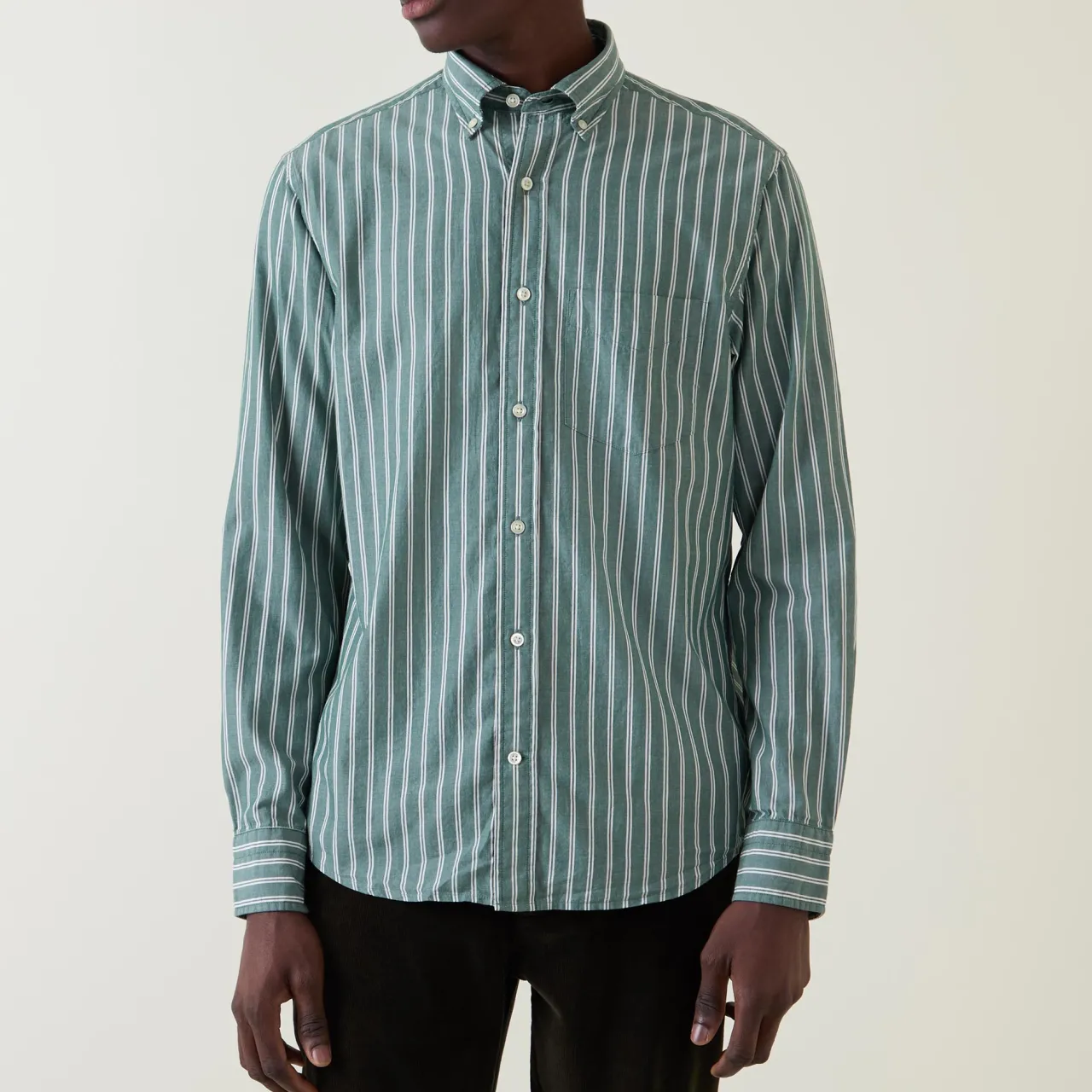 - Button-down collar, long sleeves, striped, button fastenings, curved hemline, chest pockets, buttoned cuffs