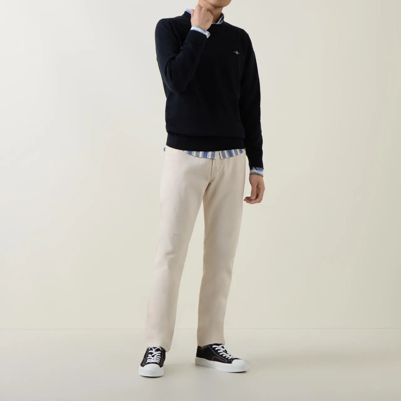 - Crew neckline, ribbed trims, fine knit structure, embroidered shield logo detail