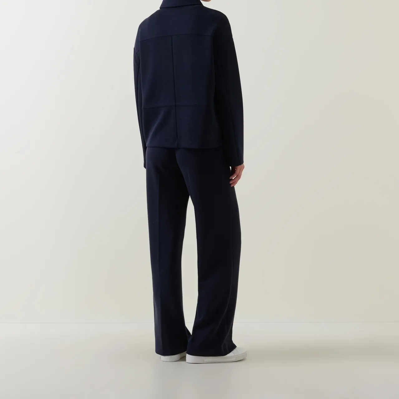 - Point collar, long sleeves, full zip-through fastening, two chest flap pockets, adjustable drawstring waistline, two side in-seam pockets, pressed creases, smooth fabric