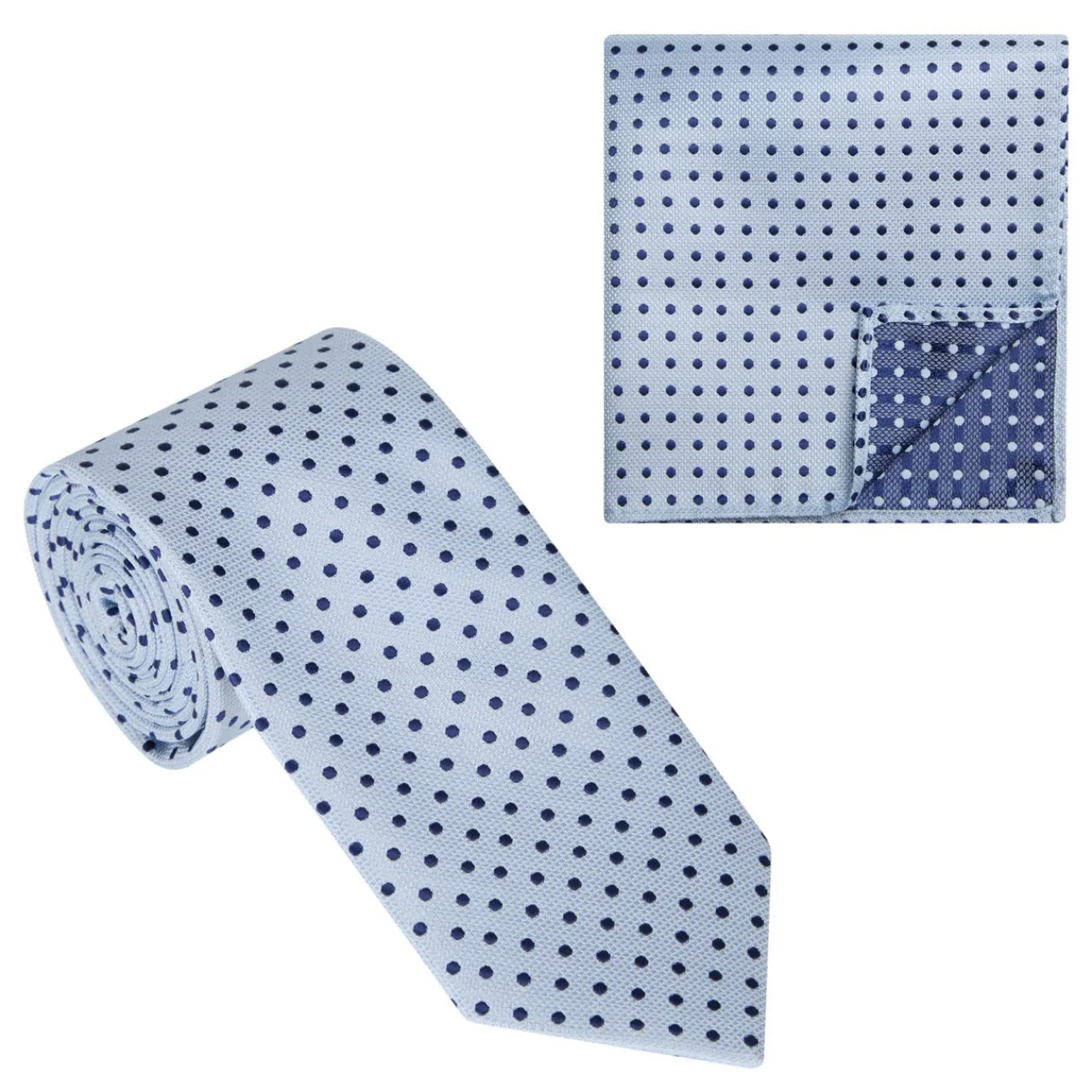 - Dotted pattern, wide blade tie, rolled ends pocketsquare