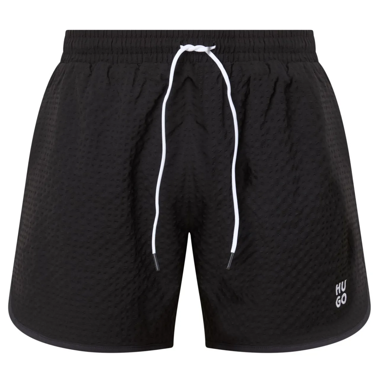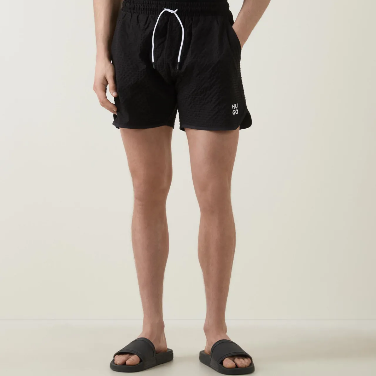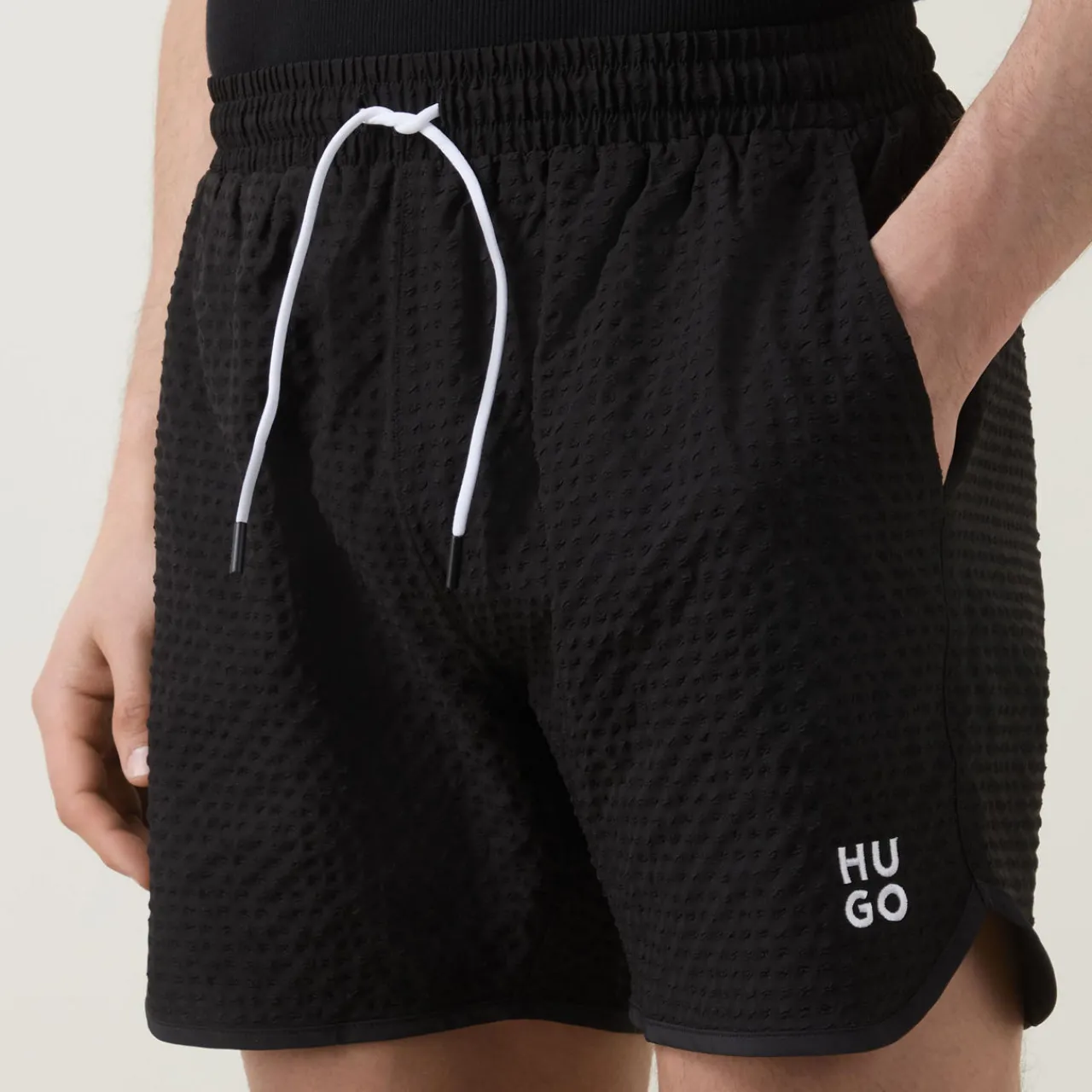 - Elasticated waistband with drawstring tie, two side pockets, rear pocket, textured finish, contrast logo detail