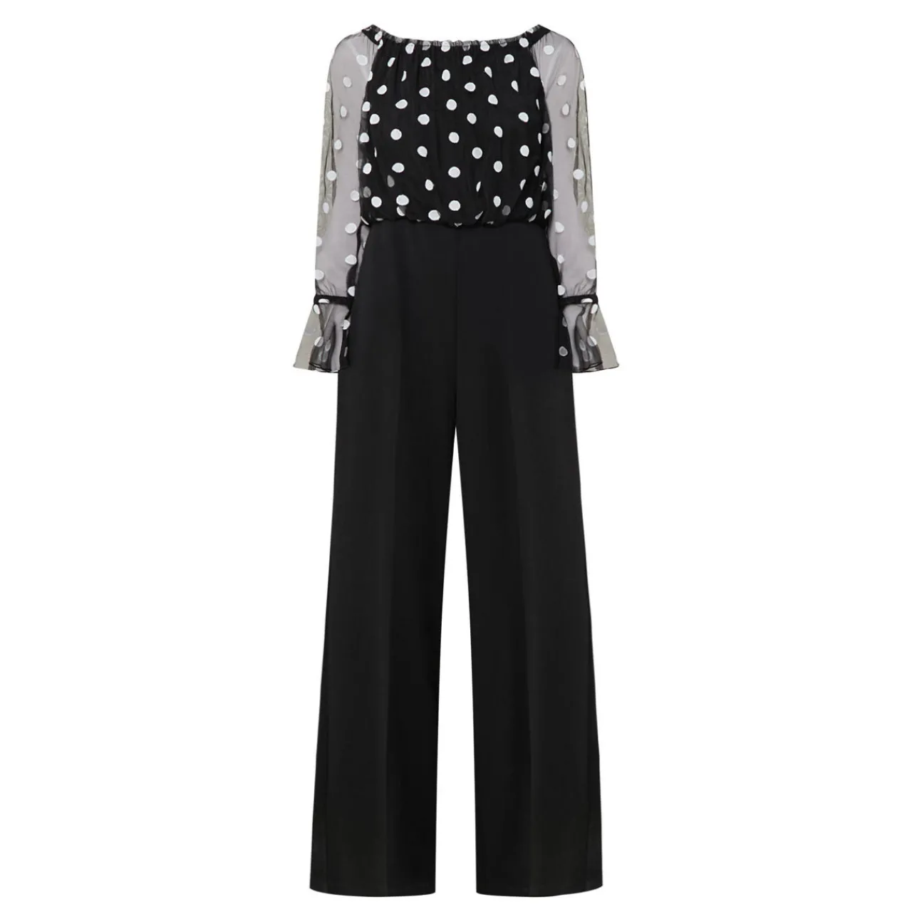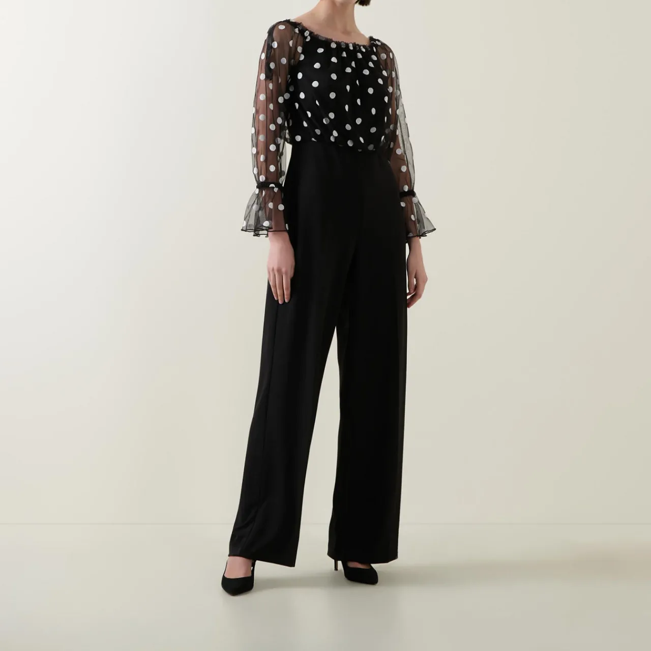 - Mesh upper half, long blouson sleeves, elasticated fluted cuffs, polka dot pattern, back zip-fastening closure, straight-cut leg, pressed creases, smooth fabric