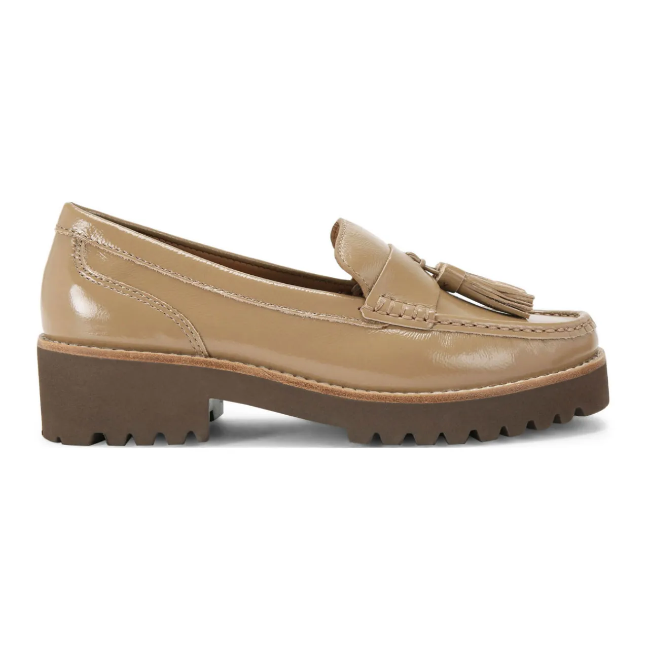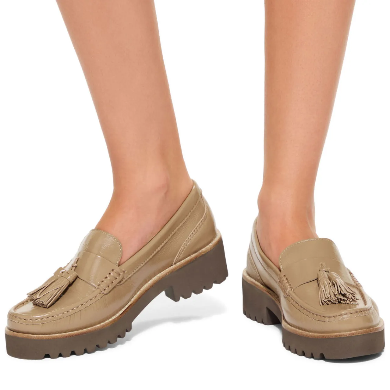 - Slip-on style, patent leather upper, two tassel details, round stitched toe, chunky sole, block heel