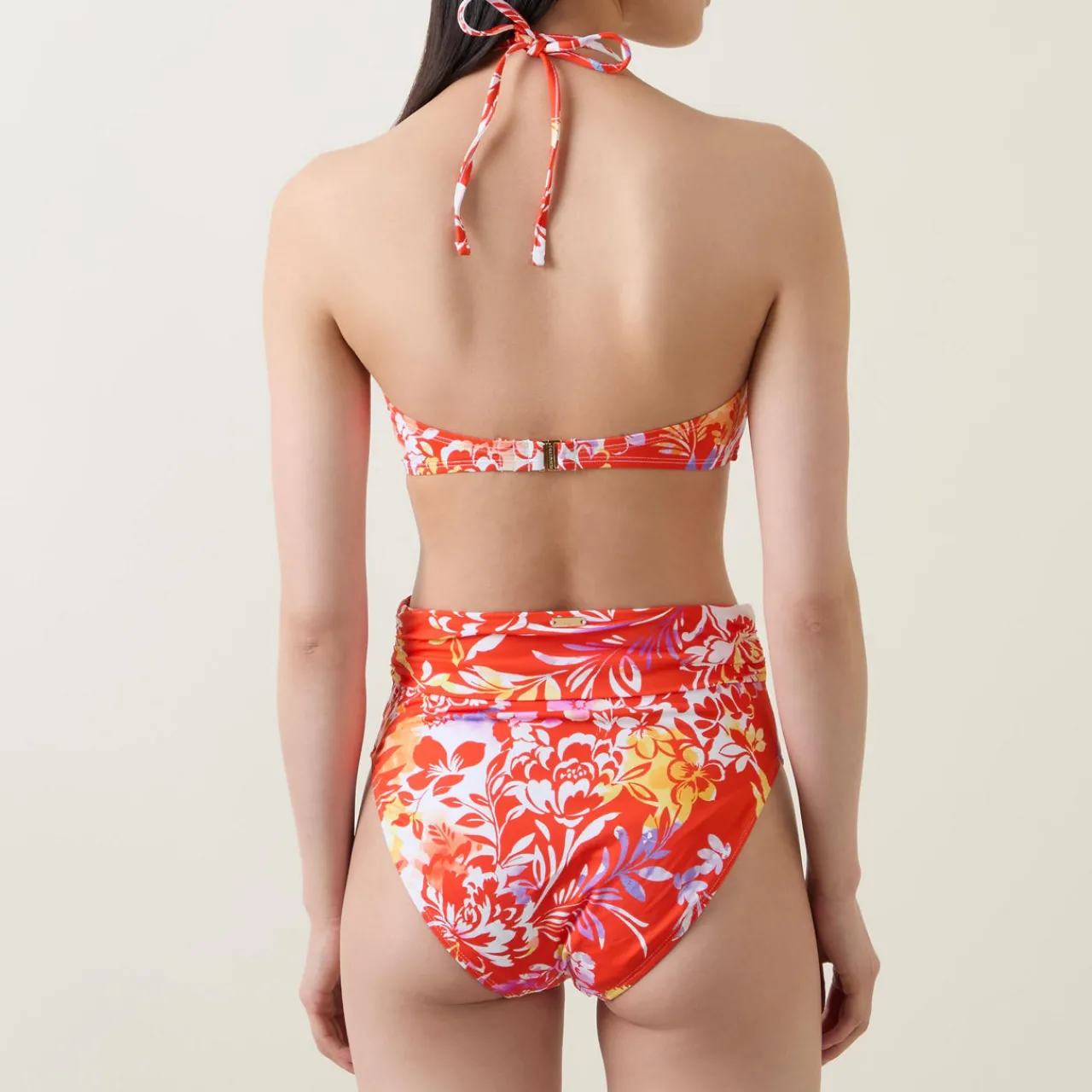 - Halter neckline with adjustable tie-fastening straps, bandeau style cups, floral pattern with contrasting colours, back clasp