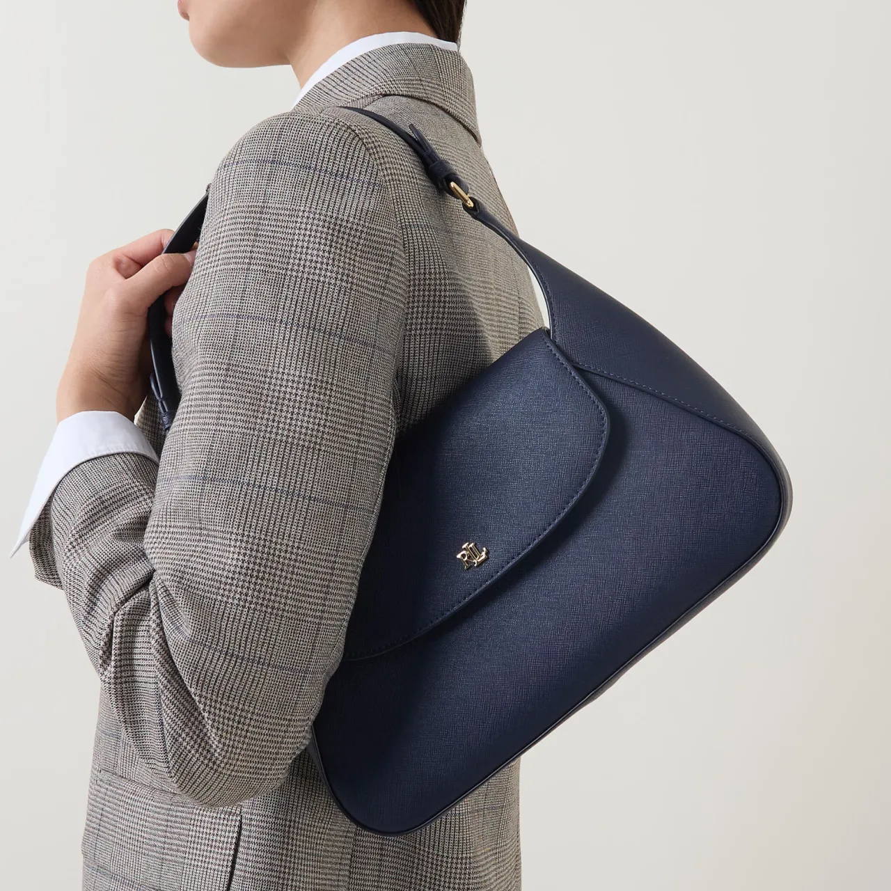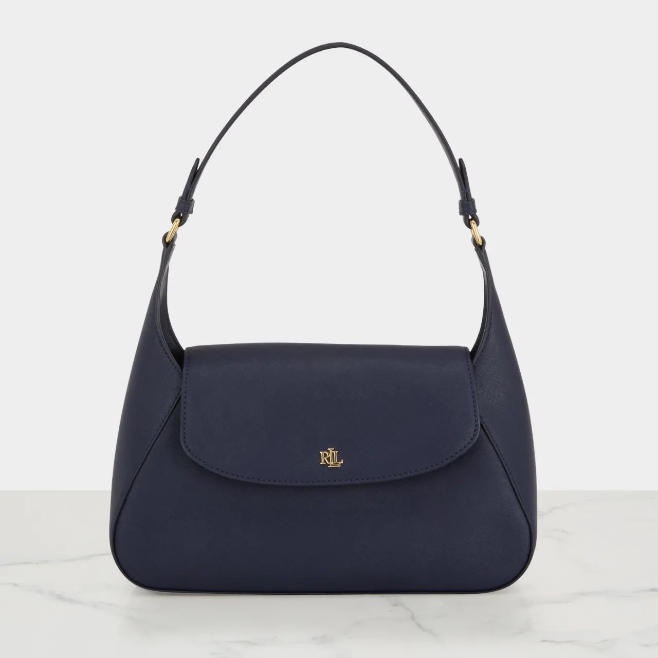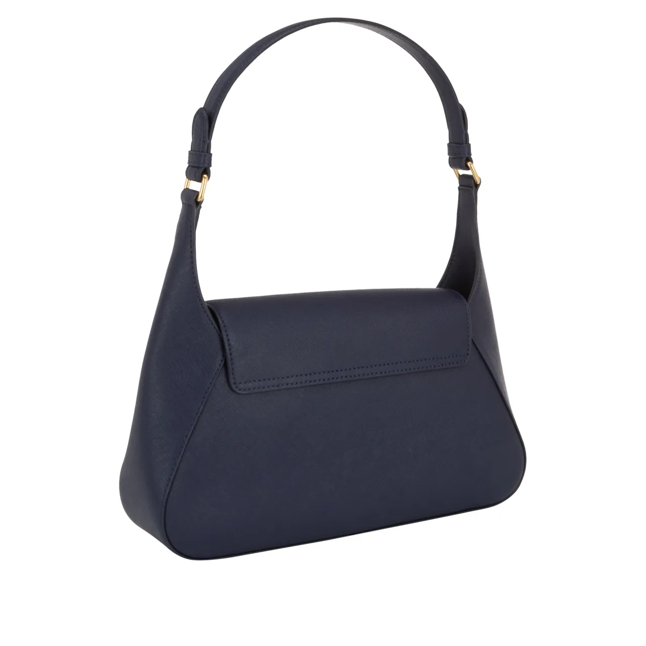 - Flap closure with magnetic fastening, shoulder strap, structured silhouette, monogram logo hardware, gold-tone finishes, textured design, tonal stitching