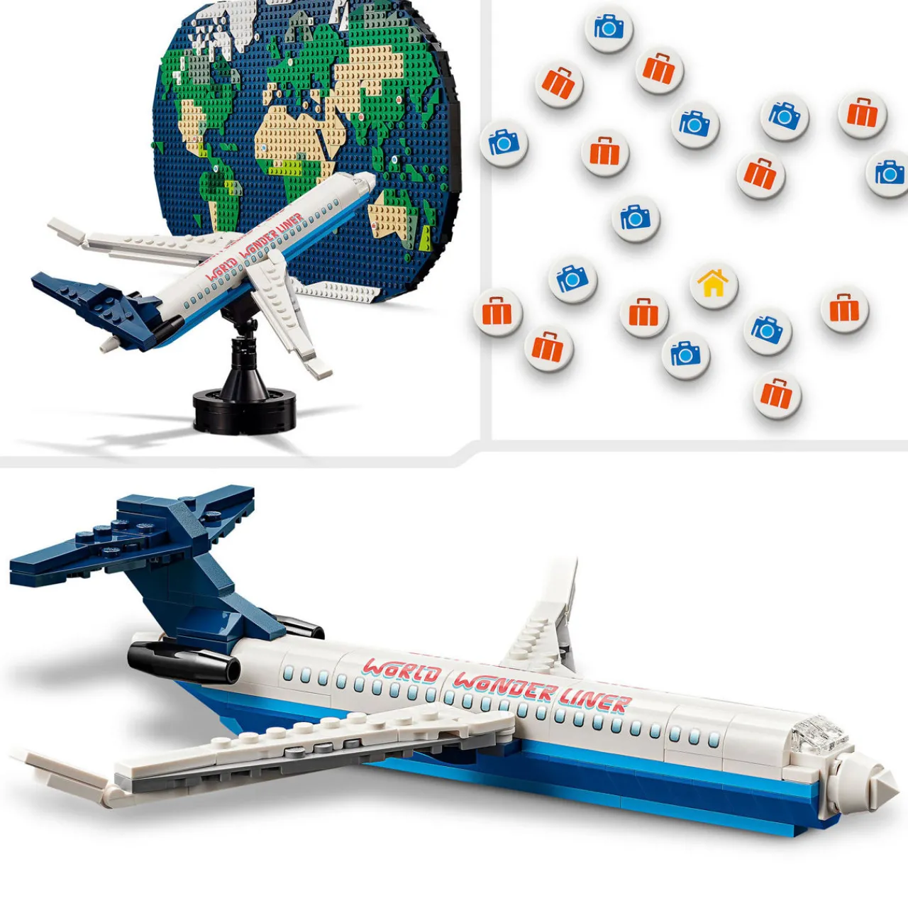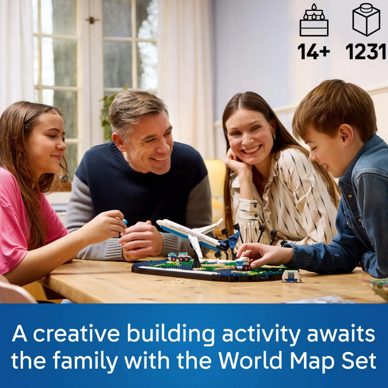- 1231 pieces, world map toy, this family building playset includes 5 sets of instructions to build a world map in 4 sections, a buildable jet, 4 micro-build vehicles, photo holders and more