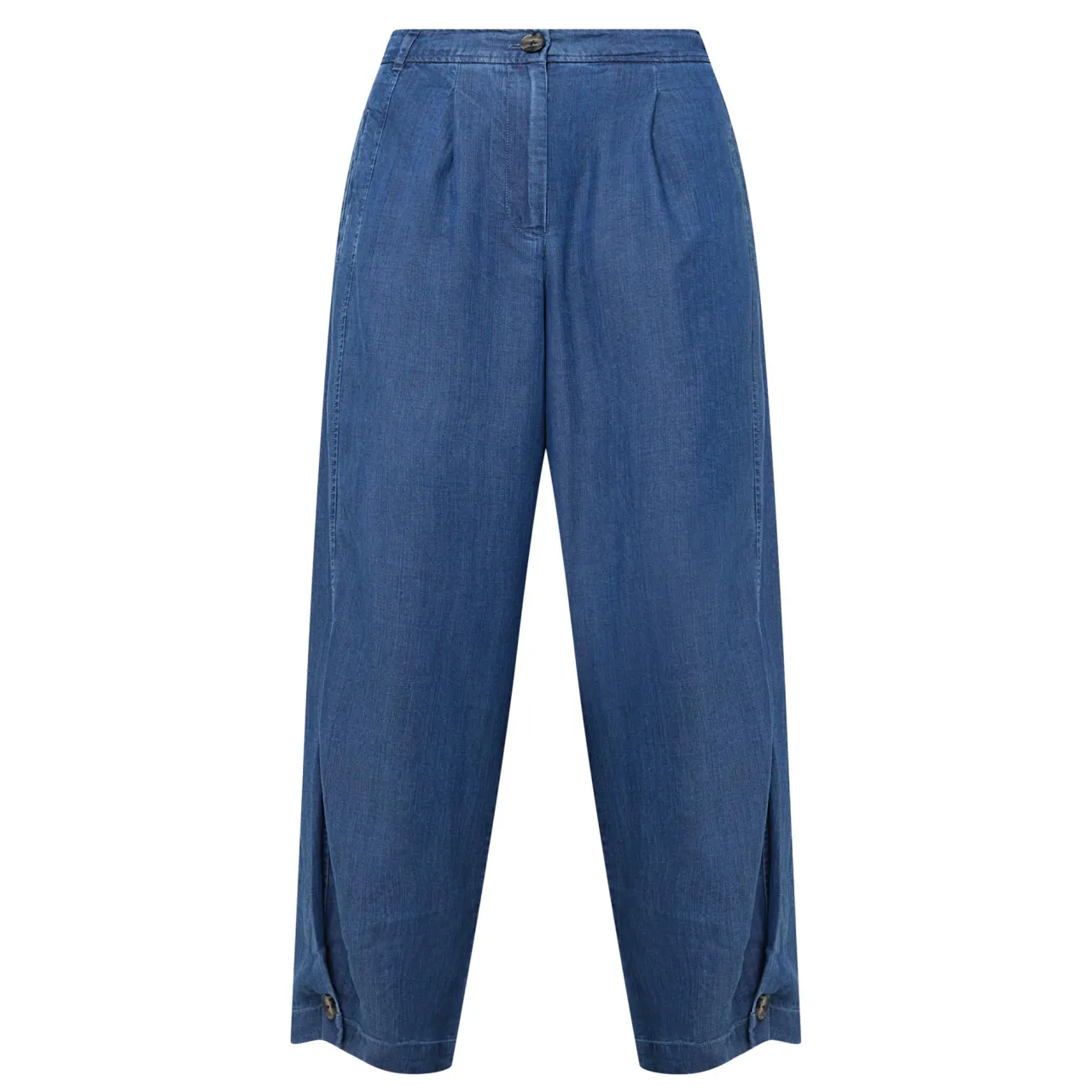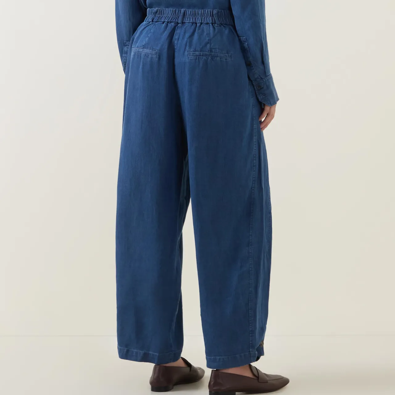 - Mid-rise, barrel leg, belt loops, rear elasticated waistband, concealed fly and button fastening, front pleats, two side seam pockets, two rear welt pockets, adjustable cuffs, tobacco stitching, soft mid-wash finish