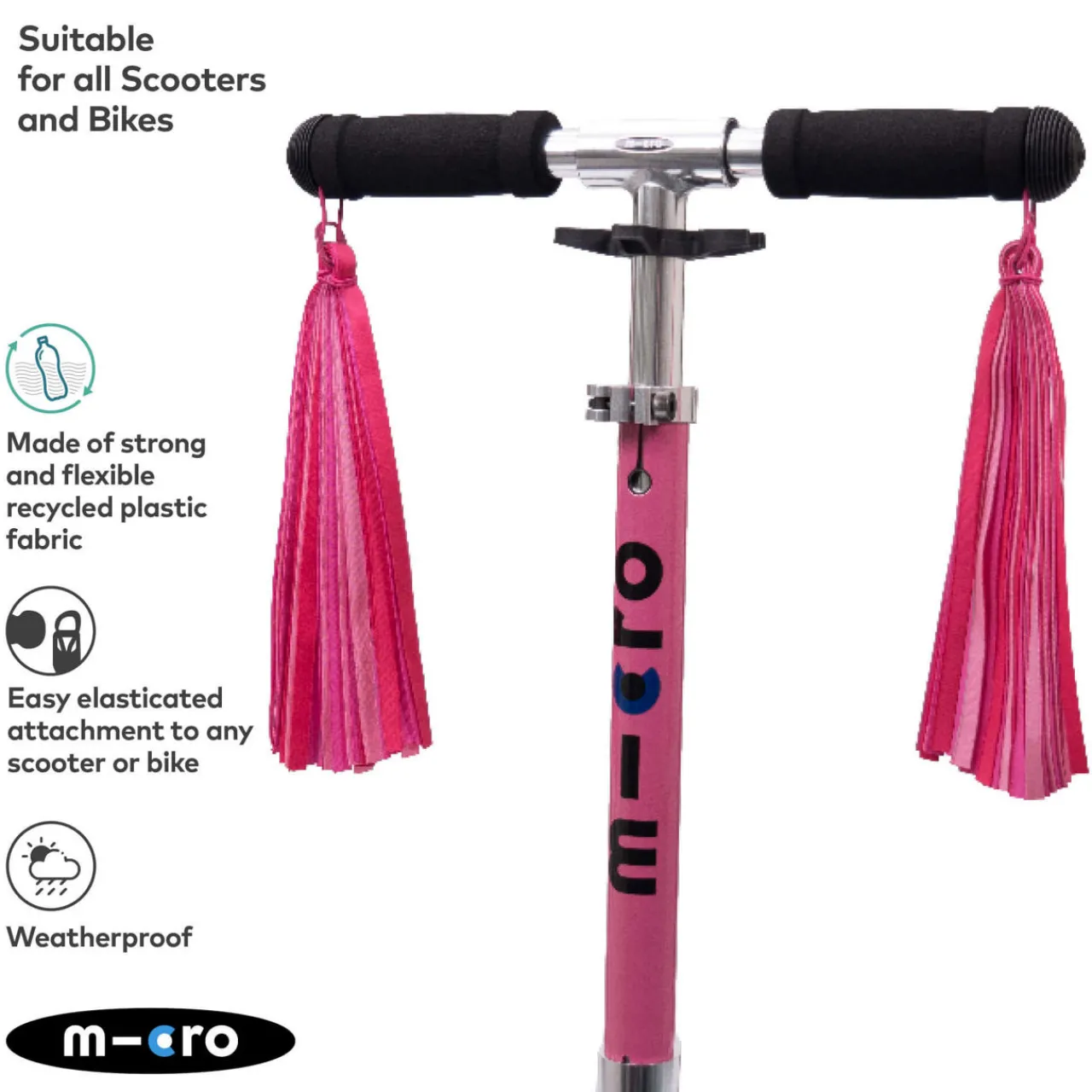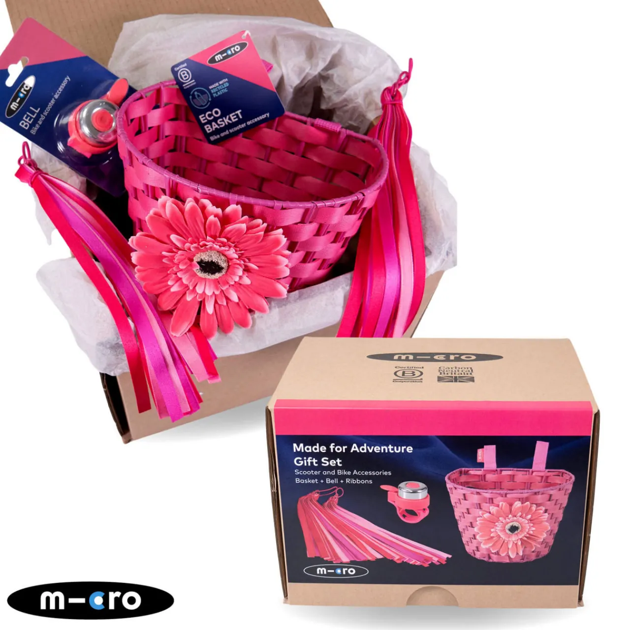 - Three essential accessories, velcro-fastening flower basket, waterproof bell, elasticated handlebar ribbons