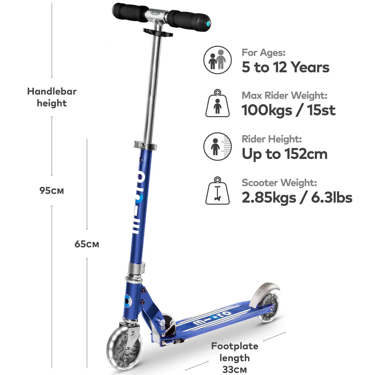 - LED Wheels, lightweight, adjustable handlebars, folds. Suitable for 5-12 years.