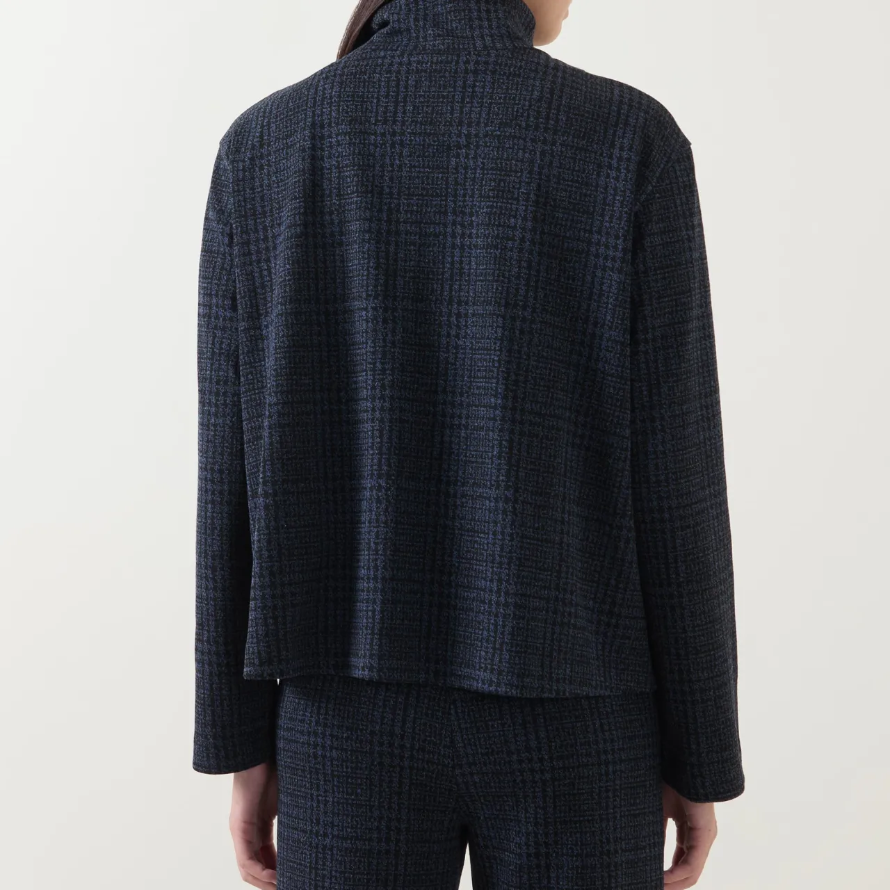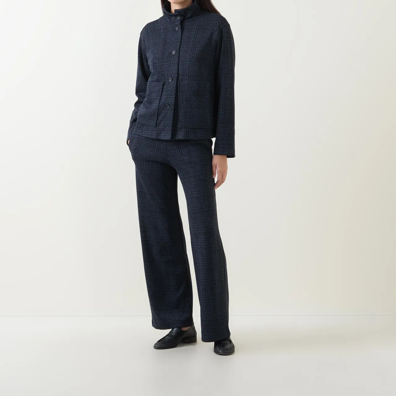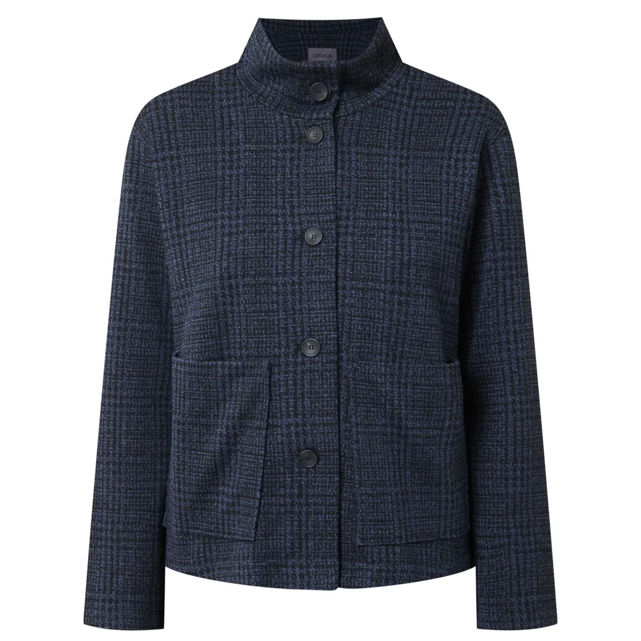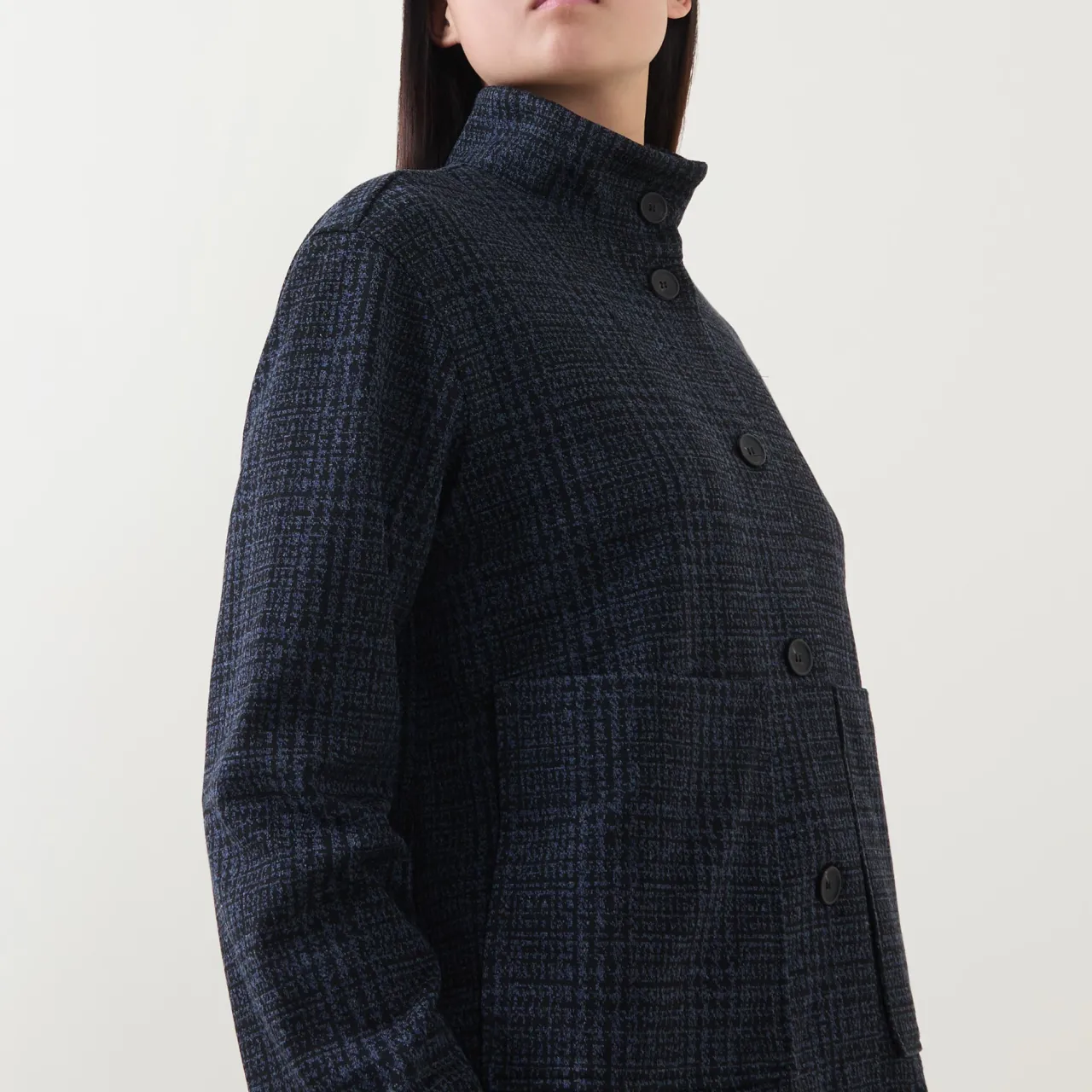 - Stand-up collar, long sleeves, dropped shoulders, button fastenings, two side patch pockets, all-over check pattern, straight hemline, smooth fabric