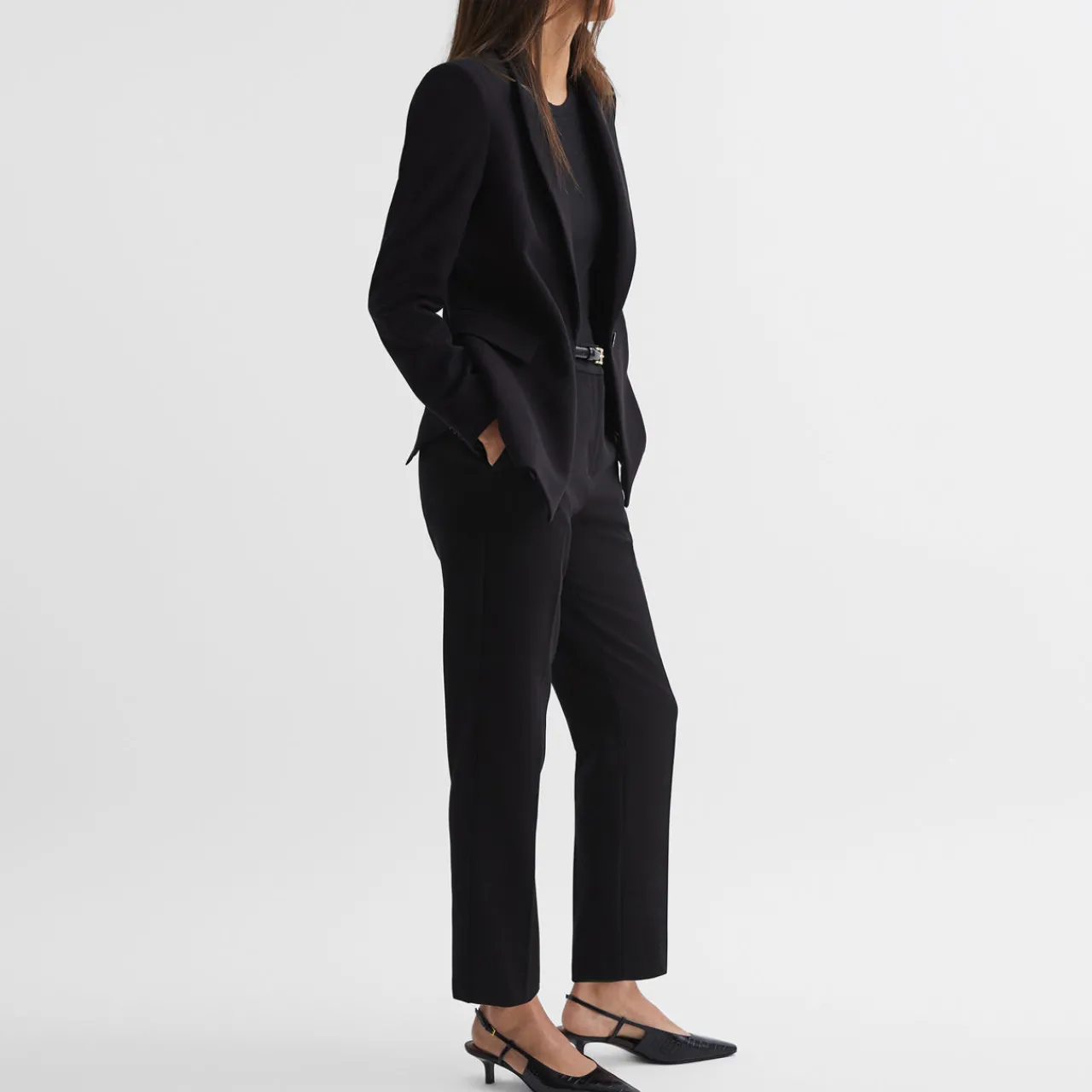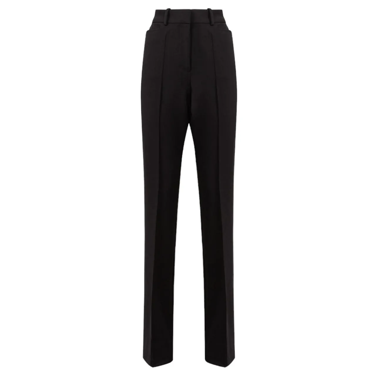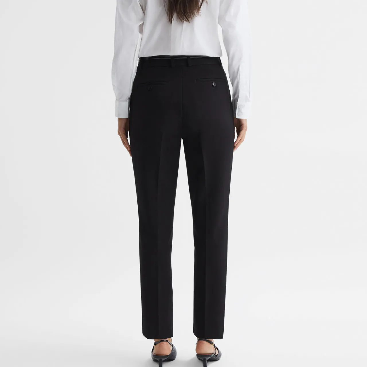 - Mid-rise, slim-leg, belt loops, concealed fly with hook-and-bar fastening, two side slit pockets, two rear welt pockets with button fastenings, clean hems, pressed creases, smooth finish
