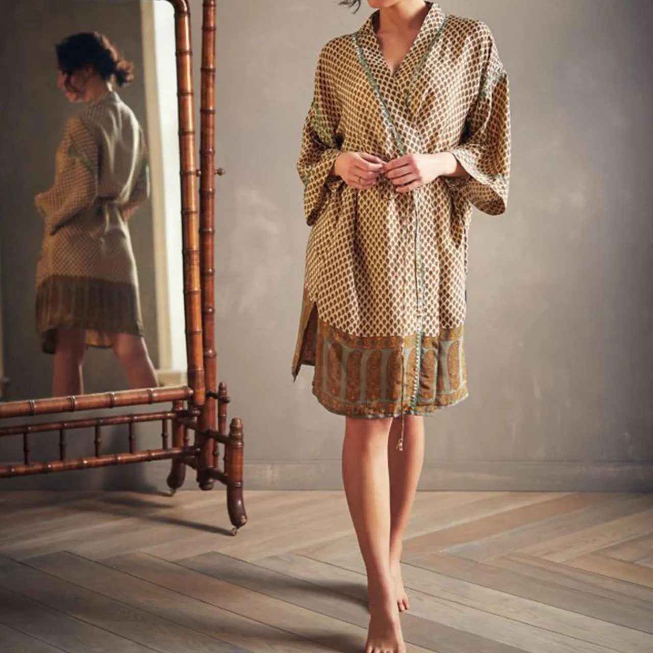The Jaypur kimono is handcrafted with dropped shoulders and loose three-quarter length sleeves. Detailed with decorative hand embroidery. You can add more shape by cinching the robe around your waist with the matching detachable tie. The kimono can be a year-round staple for your wardrobe; wear it as a coverup on the beach or use it to add a funky detail to your winter look. One size, suitable for all sizes.