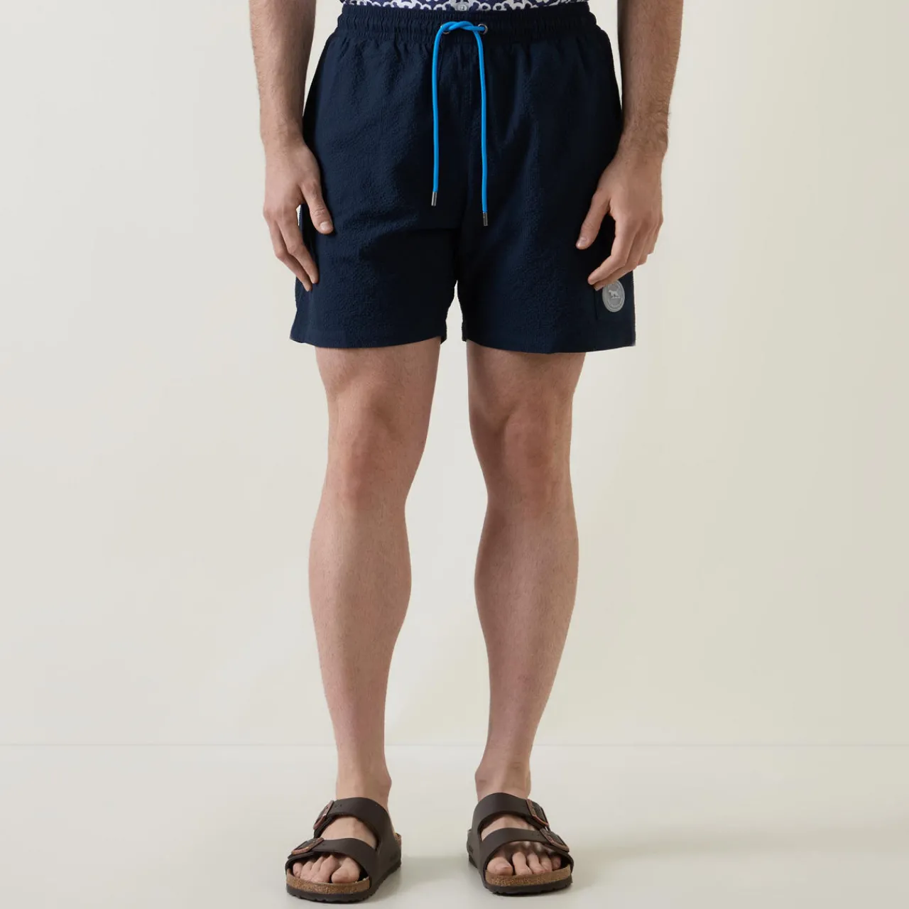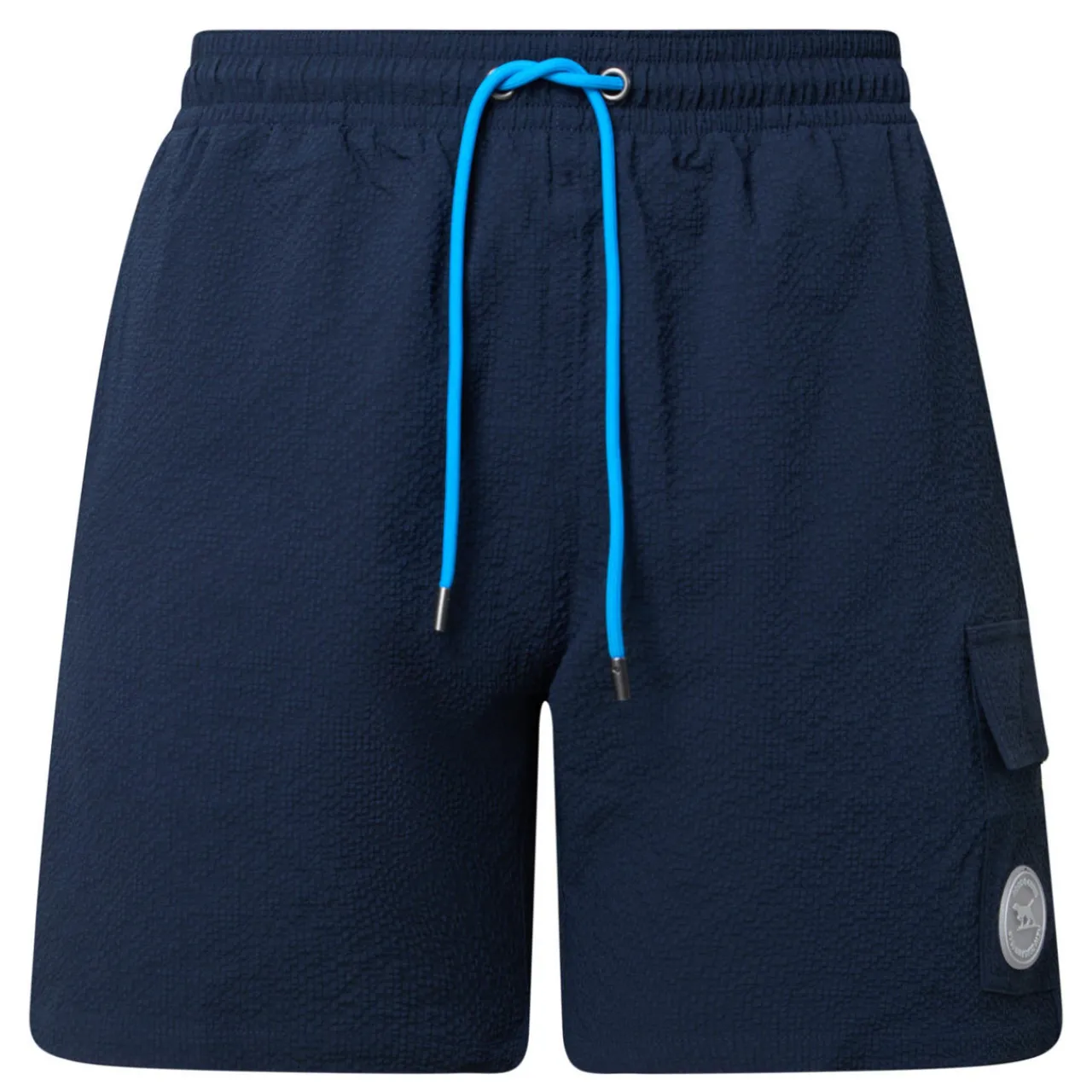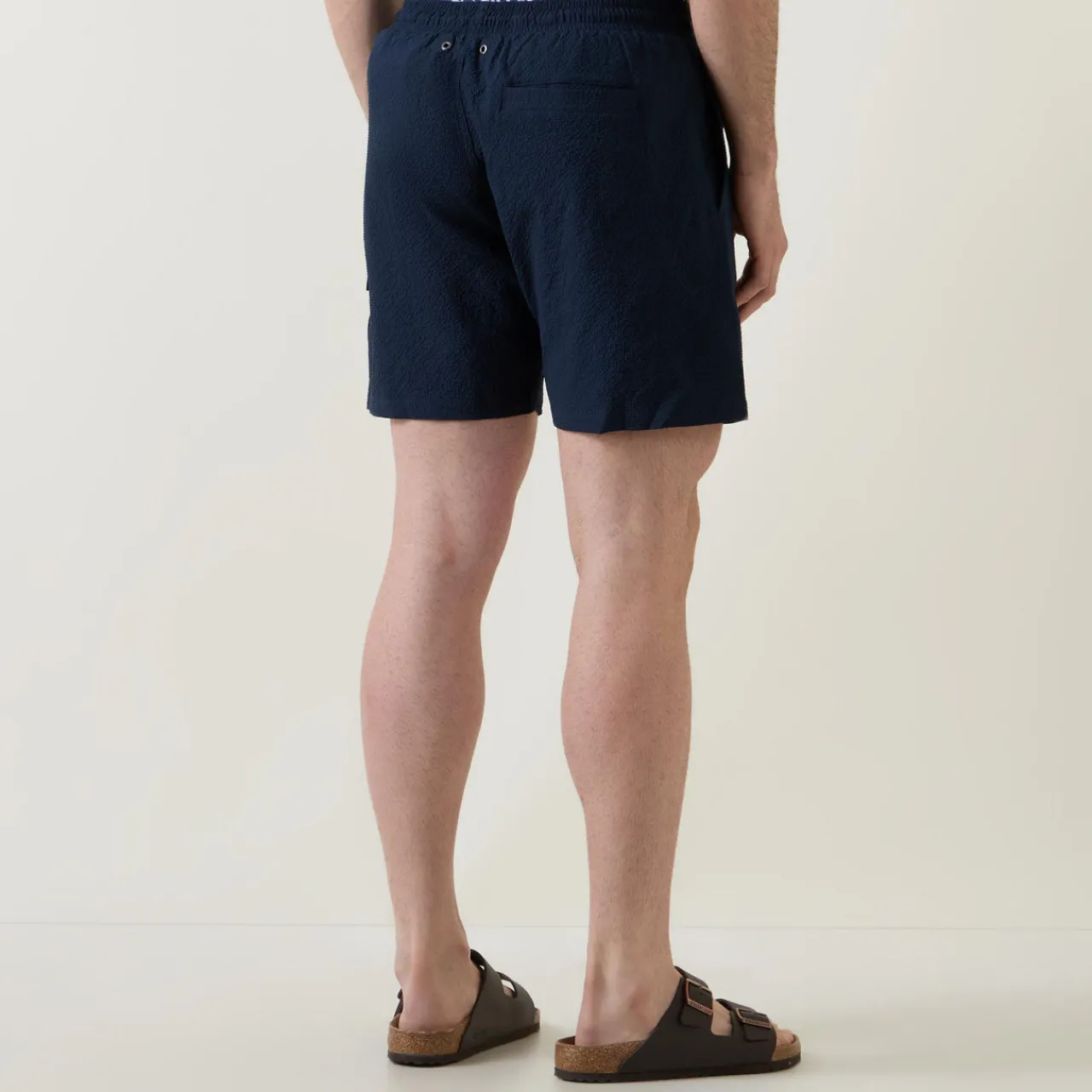 - Elasticated waistband, contrasting drawstring fastening, two side in-seam pockets, one rear welt pocket, cargo flap pocket on left side of leg, rubberised logo badge, mid-rise, straight-cut leg, lined, textured seersucker fabric