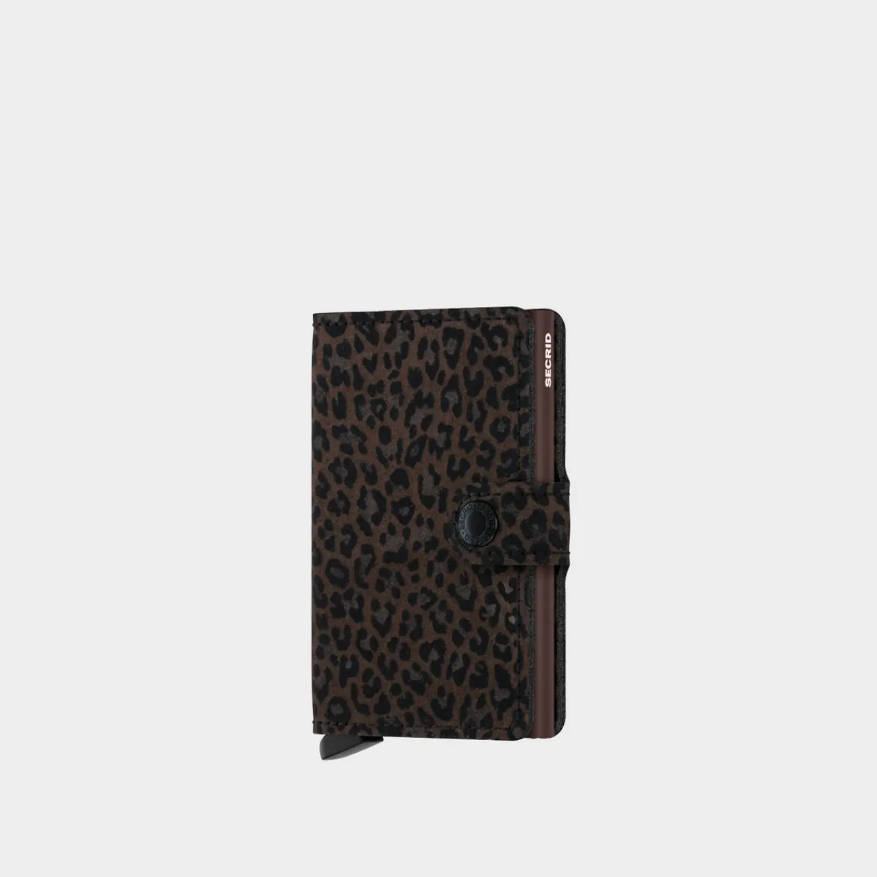 - Patented slide mechanism, brand logo details, snap-button closure, contrasting aluminium case, leopard printed leather case, RFID/NFC security